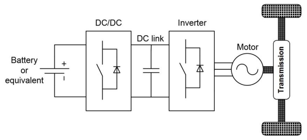 The powertrain of a vehicle includes all the necessary components used to transform stored energy into kinetic energy for propulsion purposes. In a rechargeable electric automobile, this always includes the on-board energy storage system (usually batteries, but sometimes a combination of batteries and ultracapacitors [10]), one or more bidirectional power electronics converters (usually two, one DC/DC converter and one inverter or DC/AC converter), and one or more rotatory electrical machines [11,12]. Other elements such as differentials or additional gears are also present depending on the powertrain topology. Figure 1 shows one of the most common powertrain topologies found in battery EVs, which is the one studied in this work.