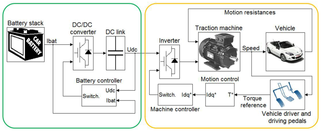 The model has two main parts, as indicated in Figure 2. The energy storage part on the left includes the battery, the DC/DC converter and its corresponding control. This part can be replaced by an ideal DC voltage source in order to simplify the model at the beginning of the learning process. The motor part in the right includes the inverter, the traction machine, the control system and the vehicle itself, modeled as an equivalent load in terms of mass, inertia and motion resistances.