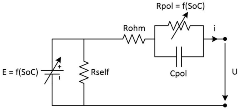 where: U: battery instantaneous voltage (V); i: battery current (A), i > 0 when discharging and i < 0 during recharge; SoC: battery state of charge (%); RSELF: self-discharge resistance (Ω); ROHM: ohmic internal resistance (Ω); RPOL: polarization internal resistance (Ω); CPOL: polarization capacitor (F); E: open-circuit nonlinear voltage (V); E0: open-circuit constant voltage (V); K: polarization constant (Ah−1) or polarization resistance constant (Ω); QMAX: maximum capacity (Ah); A: exponential voltage (V); B: exponential capacity (Ah−1).