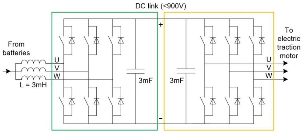 Finally, the DC link is composed of a group of capacitors (1100 V, 0.5 mF) connected in parallel. The equivalent total capacitance is 6 mF.
