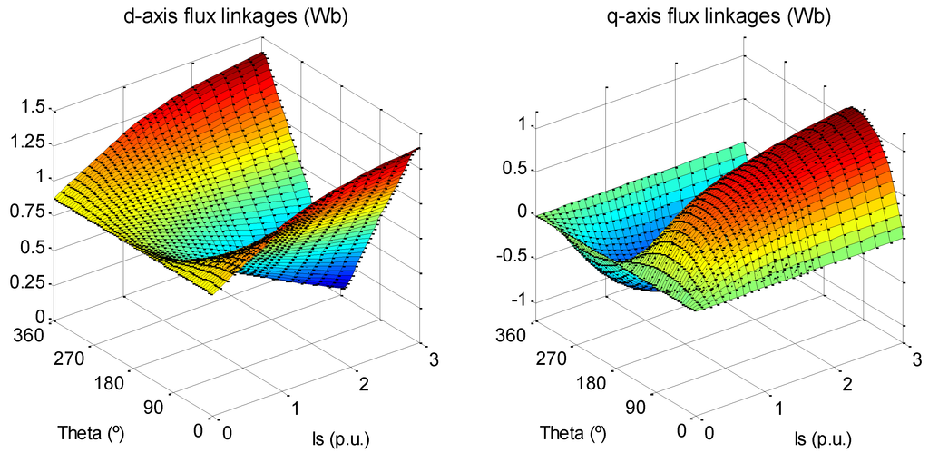 The above equations are complemented with two look-up tables (LUTs) that link stator currents to flux linkages, as expressed by Equation (8), where θS is the stator-current phasor angle:
