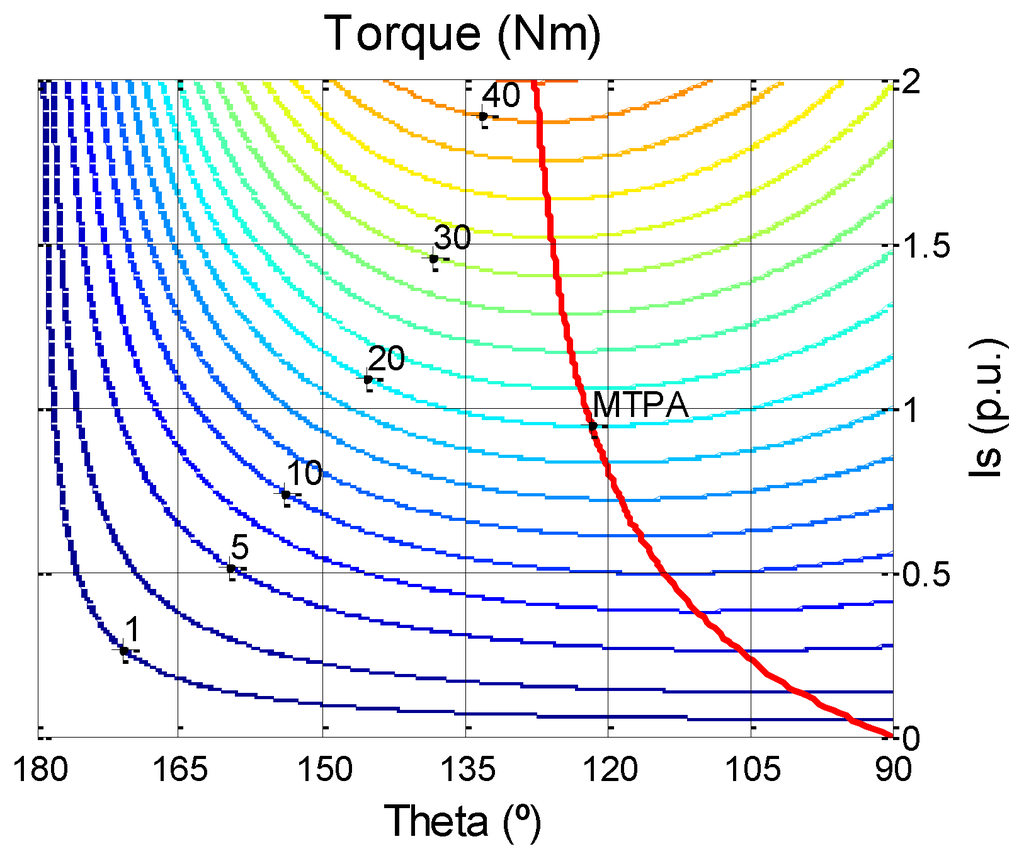 The torque generated by that same PMSM is shown in Figure 6, along with the corresponding maximum torque per ampere (MTPA) trajectory [20,23].