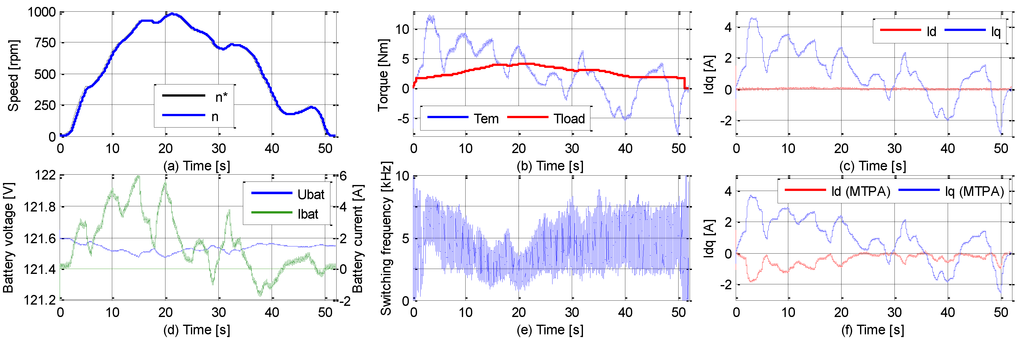 Figure 7a,b show the drive speed and torque, respectively. These results are the same for both simulations (MTPA disabled and enabled). The motor torque depicted in Figure 7b is achieved either by the Iq current in Figure 7c or by the Id and Iq currents in Figure 7f, the latter being of less RMS value. Battery voltage and current are depicted in Figure 7d, while Figure 7e shows the switching frequency for the inverter. Both Figure 7d and Figure 7e correspond to the simulation with MTPA disabled (battery and switching frequency results with MTPA enabled are not shown for the sake of space).