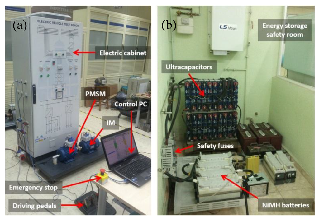 Laboratory test bench: (a) Electric cabinet containing three power electronic converters, bench with a PMSM (traction machine) and a IM (emulator machine), and driving pedals; (b) safety room for batteries and ultracapacitors.