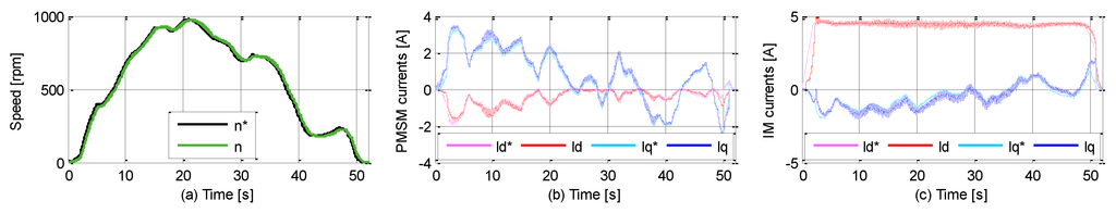 ARTEMIS driving cycle laboratory test (only the first 52 s are shown). (a) Mechanical speed; (b) PMSM dq currents; (c) IM dq currents.
