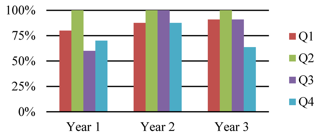 Note that Q2 asks the students to compare their current experience (the proposed activity) with an experience they have not had (such as the previous version of the course). Unfortunately, there is not enough data regarding the previous version of the course to assess how the proposed activity improves the students’ experience by comparing both feedbacks, so Q2 is used instead.