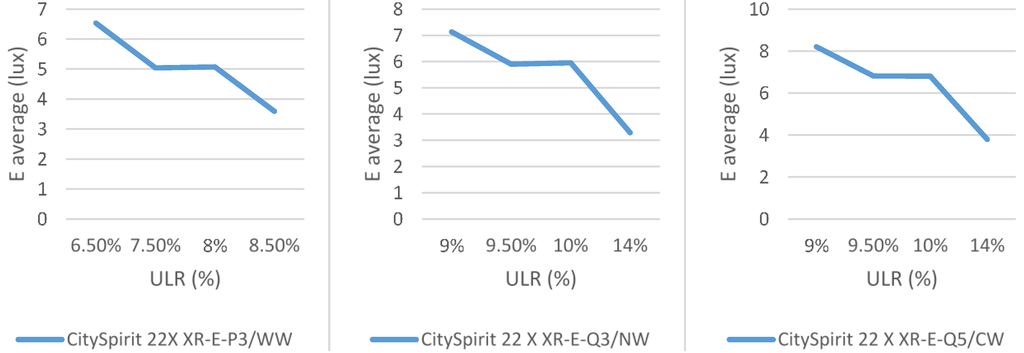 To analyze how ULR influences this kind of installation, several simulations were done with the DIALux software. The analysis consisted in studying what happens if the luminaire has the same kind of lamp and the street lighting globes are different. The model of the studied luminaire was the CitySpirit Modern (Philips, Amsterdam, The Netherlands), the street lighting globes were four and the kind of lamp was LED. Figure 1 shows the average illuminance regarding the ULR for 22 X XR-E-PE/WW, 22 X XR-E-Q3/NW and 22 X XR-E-Q5/CW lamps.