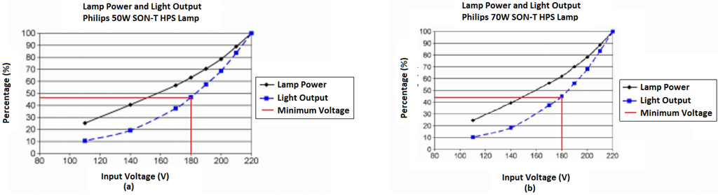 These power savings are under nominal conditions and although they might be considered insignificant, they should be taken into account because the power saving percentage in the case of a 55 W SOX is 18%. To analyze the benefit of this replacement under normal conditions, the research carried out by Omar [32] was studied. They examined the energy consumption of 277 units of 250 W HPS for a month. The energy consumption with electromagnetic ballasts was 30,913.2 kWh and the energy used with electronic ballasts was 20,172.7 kWh. Therefore in this case the energy saving was 34.74%. Besides, there are other researchers that have studied the benefits regarding the supply voltage. A good example is the research done by Dolora [33], who studied the savings for HPS 150 W lamps. This research concluded that the supply voltage bears on in the final energy consumption. Table 5 shows the power variation regarding the supply voltage.