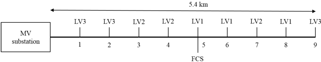 Because multiple LV feeders are connected to each MV/LV transformer, a number of simplified parallel feeders, as summarized in Table 2, are added to each of the three grid topologies, as in [29]. An aggregated load, with an equivalent number of households as for each of the three detailed feeders, is added to the end of each parallel feeder. The three LV grid topologies are each used three times, together with the fast charging station (FCS), to connect to a MV feeder with 9 nodes, as illustrated in Figure 2. As a result, a total of 2340 household loads are connected to the MV feeder. The rated MV line-to-line voltage is 11 kV, and the distance between each node is 600 m. This is a realistic urban MV feeder topology for Flanders [44], where MV grids are operated in an open-ring topology with few or absent laterals [45]. The MV cable is a three-core armored aluminum conductor, i.e., Al 11 kV-3 × 95 mm2, with an impedance of 0.411 + 0.105i Ω/km, and a current rating of 200 A [46].