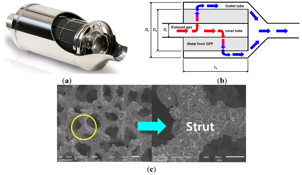 Figure 1 shows a schematic diagram of the cross-sectional area of the metal foam-type particulate filter. The metal foam has the shape of a circular annular tube, and exhaust gas flows radially from the inside to the outside of the annular tube. Metal foams have various advantages for use as filter media and substrates in internal combustion engines [38,39]. First, metal foams of various pore sizes, from 450 to 1200 micron, can be produced and the resulting porosities range around 85%–95%.