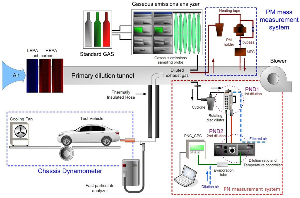Figure 2 shows a schematic diagram of the experimental apparatus that was used to analyze the concentrations of nano-PM and the regulated emissions for vehicle mode tests. A 48-inch single roll chassis dynamometer (M4500, AVL, Graz, Austria), a gaseous emission analyzer (MEXA-7200H, Horiba, Kyoto, Japan) and a full-flow CVS exhaust dilution tunnel system (CVS-7200S and DLT-1230, Horiba) measured the particle emissions, regulated emissions, carbon dioxide (CO2), and fuel economy. Fluorocarbon-coated glass filters (TX40, Pallflex, Port Washington, NY, USA) were used to collect particulates, which were measured using an analytical balance (CPA2P-F, Sartorius, Göttingen, Germany).