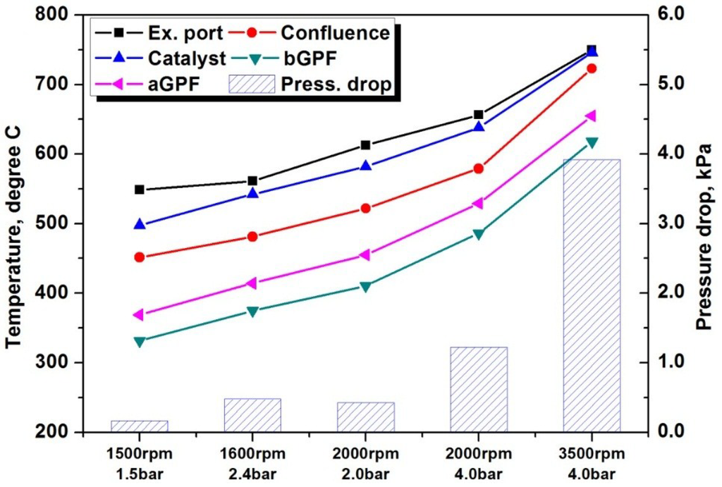 Exhaust system temperatures and pressure drop of GPF in various part-load conditions; (start of injection (SOI), 300°–304° CA before top dead center (BTDC); Lambda = 1.0; spark advance (SA) = minimum spark advance for the best torque (MBT)).