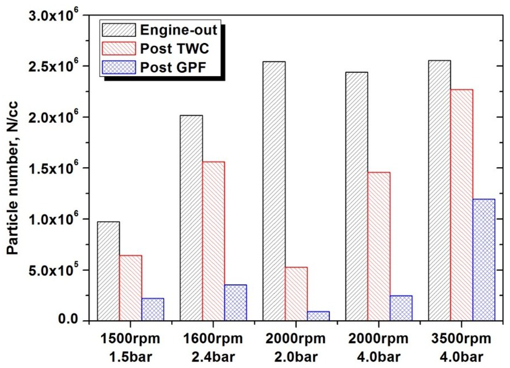 The TWC slightly removed the volatile hydrocarbon particle precursors by 22%–79% under low- and middle- engine speed and low- and middle-load conditions, while the TWC showed a small effect on particle emissions with a reduction of 11% under the high-engine speed, high-load conditions because of the higher exhaust flow rate. The filtration efficiency of the GPF was reached around 77%–96% in the low-to-medium part-load engine operating conditions. However, lower filtering efficiency of 53% was obtained at high speed condition by passive regeneration inside the GPF under high exhaust gas temperature above 650 °C. The size-resolved particle concentration from the GPF-GDI engine presented that both the nucleation and the accumulation mode particles were simultaneously reduced under steady-state part-load engine operating conditions.