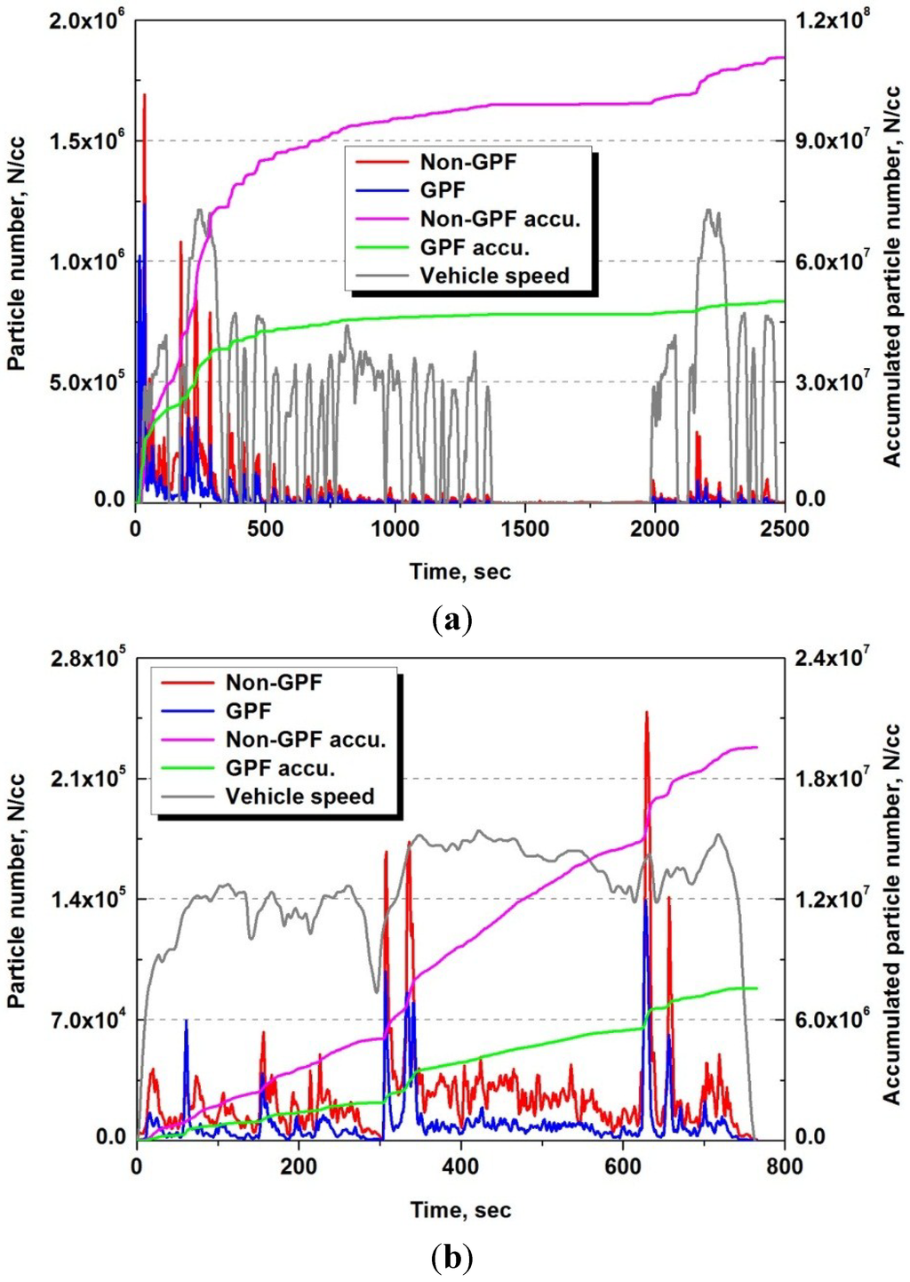 Real-time particle number concentration by CPC of FTP-75 and HWFET mode; (a) FTP-75 mode; (b) HWFET mode.