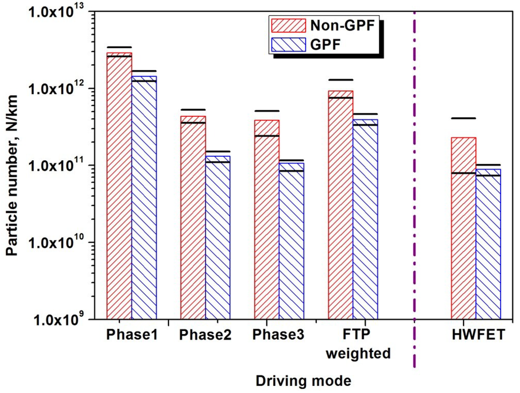 Figure 7 shows the comparison of PN concentration levels of each phase of FTP-75 and HWFET mode with base GDI and GPF-equipped GDI vehicle. All the data of the particle concentration were tested about three times and averaged. The particle emissions were 2.89 × 1012 N/km in phase 1 of the FTP-75 mode, and decreased to 4.36 × 1011 and 3.86 × 1011 N/km in the subsequent cycles, respectively, for the non-GPF case. The average FTP-75 weighted total particle emission was 9.32 × 1011 N/km. The particle emissions for the GPF-equipped vehicles were 1.43 × 1012 N/km for phase 1 of the FTP-75 mode, and they were 1.31 × 1011 and 1.07 × 1011 N/km in the subsequent cycles, respectively. The FTP-75 weighted total particle emission was 3.95 × 1011 N/km, which was 57.6% less than that of the non-GPF case.