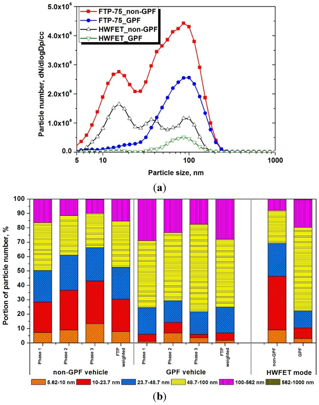 Comparison of size-resolved particle concentration and portion of particle number by DMS500 in FTP-75 and HWFET mode; (a) particle number concentration and size distribution; (b) portion of size-resolved particle number concentration.
