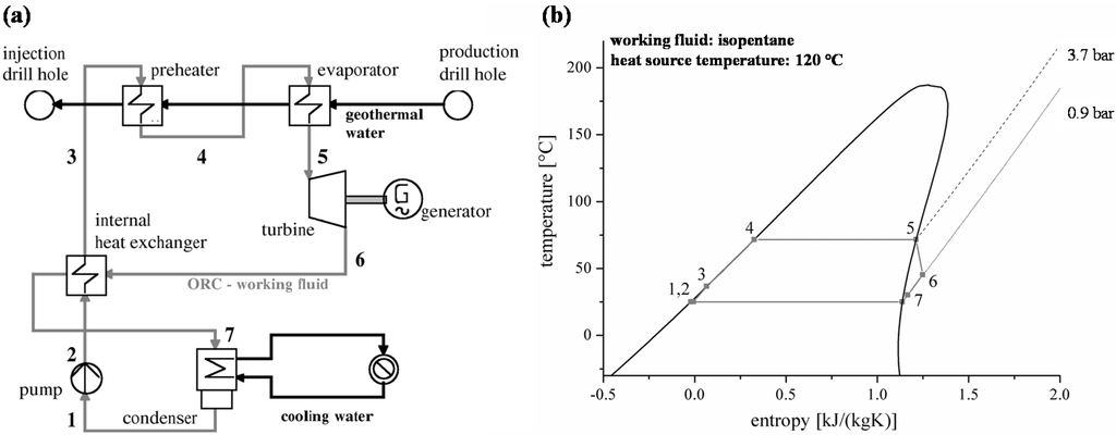 (a) Scheme of the geothermal ORC power plant; (b) Corresponding T,s-diagram for the ORC using the working fluid isopentane.
