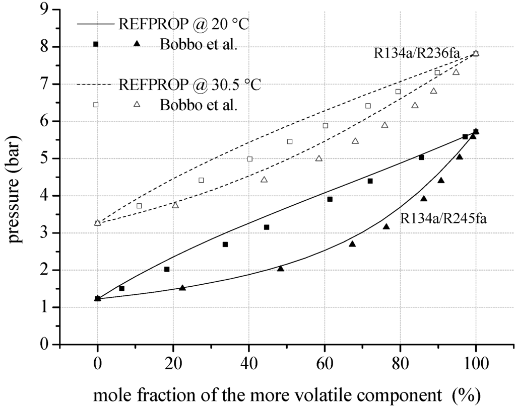 The fluid properties of pure fluids and fluid mixtures are calculated by the REFPROP database Version 8.0 [45]. The reliability of fluid properties is discussed comparing experimental data from literature and theoretical data for vapour-liquid equilibrium (VLE) calculated by REFPROP. In addition, selected properties like liquid and gaseous density or heat capacity are compared to experimental data.