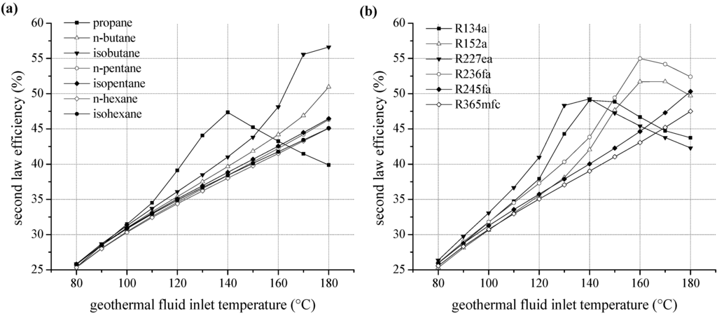 We examined the second law efficiency of the ORC depending on inlet temperature of the geothermal fluid in the range of 80 and 180 °C. Figure 6a shows the exergetic efficiency as a function of heat source temperature for ORC systems using pure natural hydrocarbons as working fluids. For temperatures below 130 °C, relative differences of second law efficiency are maximal 5%. Considering the homologous series of alkanes, starting from isobutane, the margin of fluctuation related to fluid selection is low. More volatile components lead to more efficient cycles; this is also applicable for higher heat source temperatures. The ranking correlates with the critical temperature, too. Second law efficiency increases with rising temperature except choosing propane as a working fluid. For propane, an efficiency optimum at 140 °C is obtained due to a shift of the pinch-point from the preheater outlet to the inlet. Additionally, an expansion into the two-phase region has to be taken into account, evaluating propane as working fluid. A minimal vapour quality of 94.9% at the turbine outlet is determined for 130 °C inlet temperature of the geothermal fluid. However, compared to isopentane the second law efficiency is increased by up to 21.9% for the use of propane as a working fluid. For temperatures higher than 150 °C, the efficiency decreases below alternatively considered hydrocarbons.