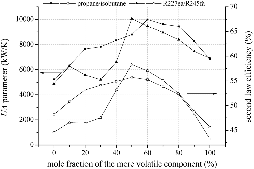 For low-temperature heat sources Andreasen et al. [28] considered pure components and their zeotropic mixtures as working fluids for subcritical and transcritical cycles. In case of 120 °C heat source temperature, mixtures of propane and higher boiling natural hydrocarbons as well as isobutane/isopentane show high first law efficiencies for subcritical cycles. Among the considered pure fluids R227ea is suitable. In general, the heat exchange capacity for the condenser increases for the investigated mixtures, which is an indicator for additional required heat transfer surface. Lecompte et al. [29] perform a second law analysis for heat source temperatures between 120 and 160 °C. Subcritical ORCs are investigated for eight zeotropic mixtures and their pure components. For a heat source temperature of 150 °C, isobutane/isopentane with mole concentrations of 0.81/0.19 leads to an increase in efficiency of 7.1% compared to the most efficient pure component. In this case, the resulting temperature glide at condensation lead to a good match of the temperature profiles in the condenser. Dong et al. [30] describe this fundamental relation in the same way for a high-temperature heat source and siloxane mixtures. Also, the reduction of irreversibilities in the condenser affects the efficiency more than the one in the evaporator. The mentioned investigations of ORC systems using zeotropic mixtures as working fluids were conducted with the focus on the optimization of first or second law efficiency. Studies including the evaluation of heat transfer requirements and consequently economic parameters have not been published yet. However, Weith et al. [31] recently show for a waste heat recovery application of the ORC that the use of a siloxane mixture leads to an efficiency increase of 3% compared to the most efficient pure component. This performance improvement is accompanied by a 14% higher heat transfer surface of the evaporator.