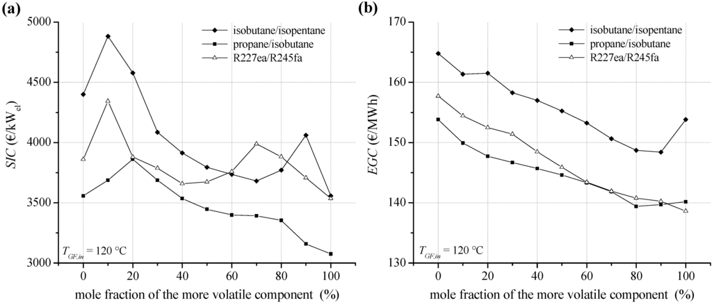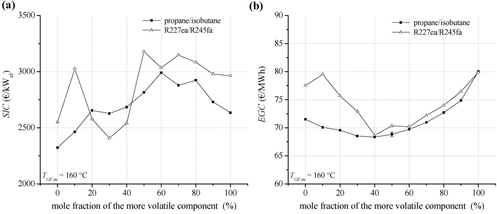 Regarding a heat source temperature of 160 °C, SIC and EGC are illustrated in Figure 15a,b. Compared to lower heat source temperatures, the level and the bandwidth of SIC are decreased. Compared to geothermal inlet temperature of 120 °C, the percentage of heat exchanger costs is even increased. For the considered working fluids 62.3% to 77.1% of the total PEC are related to heat exchangers. For propane/isobutane SIC range between 2,322 and 2,990 €/kW, in case of R227ea/R245fa between 2,407 €/kW and 3,147 €/kW. Considering EGC, fluid mixtures as ORC working fluids lead to a significant improvement of economic conditions for geothermal power generation. Compared to the most cost-efficient pure component R245fa, a decrease of 10.0% for EGC is determined in case of R227ea/R245fa (60/40). The lowest EGC of 68.4 €/MWh are obtained for propane/isobutane. A mole fraction of 60% isobutane leads to a reduction of EGC of 4.0% compared to propane. In general, the obtained SIC are in a good agreement to the mentioned investigations [40,41,42,43].