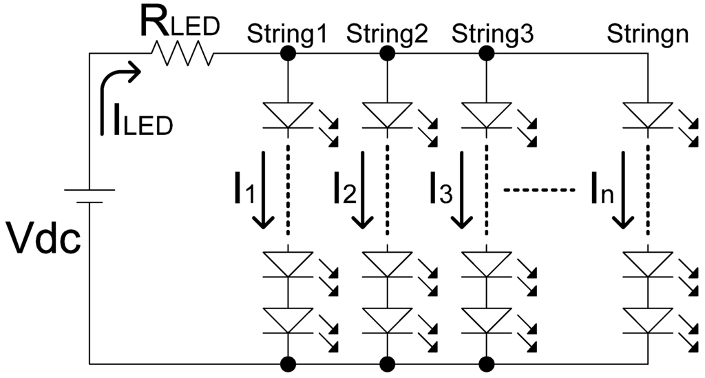 Figure 1 shows a simplified LED driving circuit with a multi-string structure. Since the currents differ between each channel according to the impedance, a large current can be injected into one channel of low impedance and can reduce the life time of the LEDs, leading to their destruction [9,10]. Recently, to achieve LEDs with high luminous efficiency, multi LEDs are used in a single luminary structure. In the case of multi-string lighting, each LED string has a different impedance. Because all the LEDs (Vf) have different voltages, an individual boost or buck PWM converter is needed for each LED. In addition, in the case of outdoor lights such as street lights and security lights, variable brightness is needed according to the lighting conditions and a multi LED driver is required [11,12,13]. However, when applying individual converters to each LED, the system cost is increased and the efficiency and life time of the system are reduced.