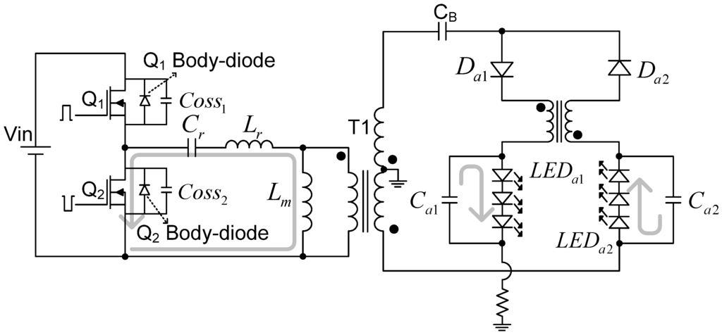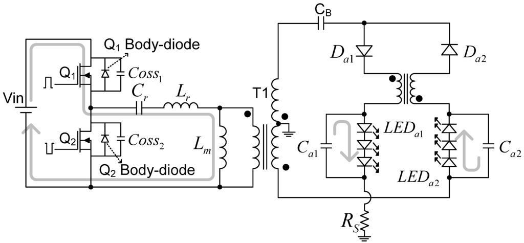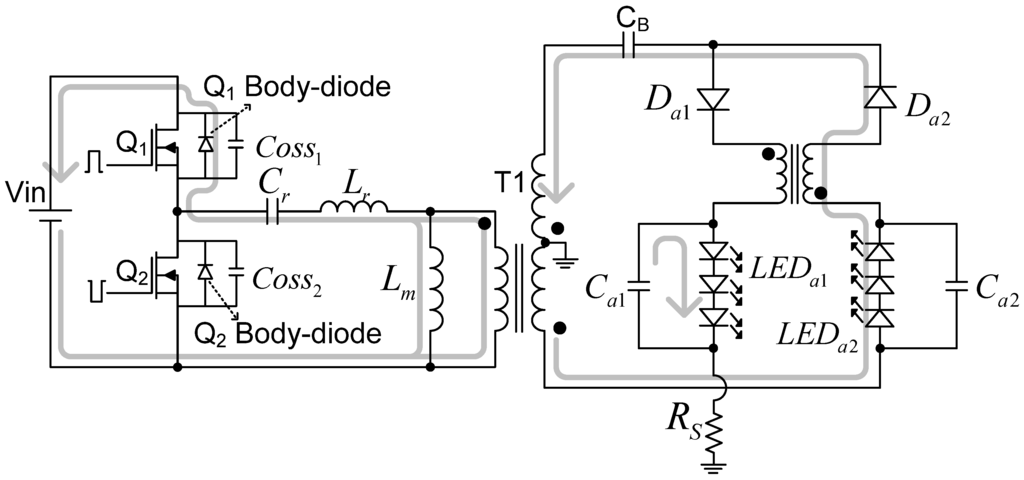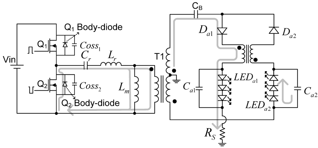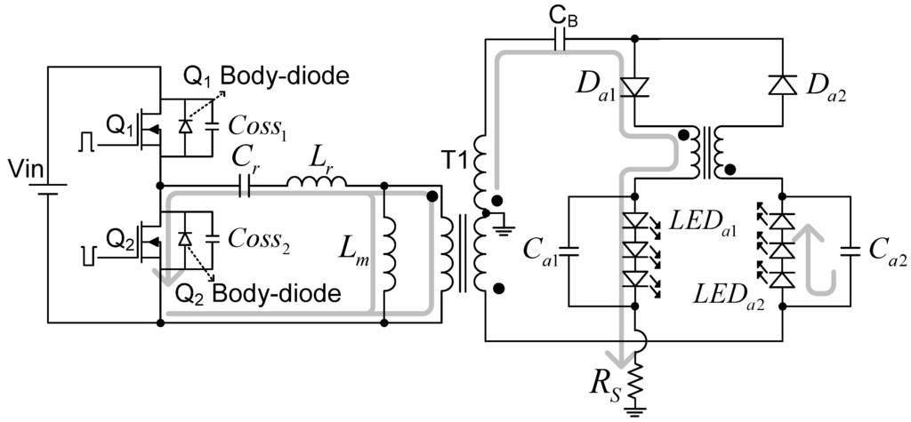 becomes zero (ZVS Condition). An output current flows to the LED load through capacitor