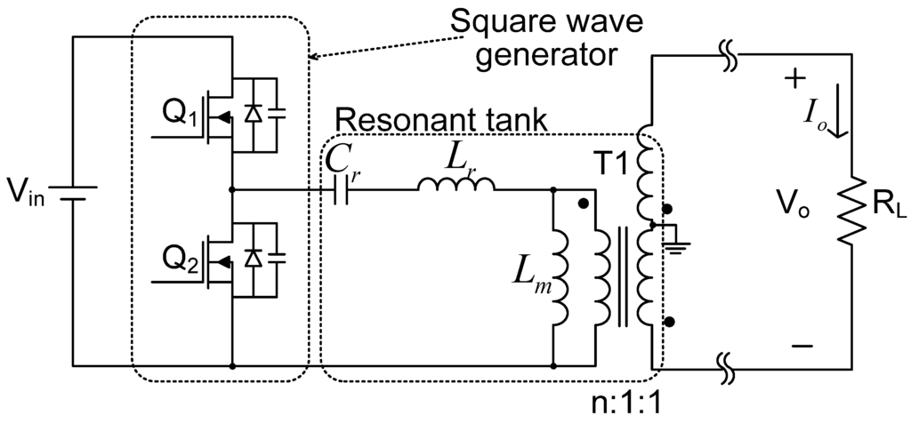 - A resonant tank block consisting of a capacitor and magnetizing inductance of transformer . The resonance tank operates with high frequency and creates a sinusoidal current from the square wave voltage from BLK2. Since the primary current is delayed by resonance, MOSFET is turned on with the ZVS condition.