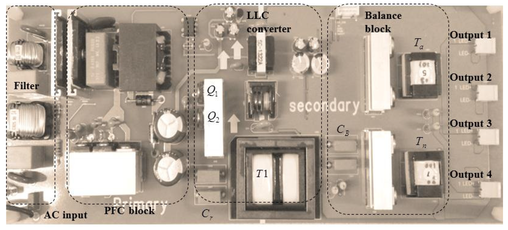 Table 2 shows a comparison of the presented converter and a conventional converter. As shown, the proposed converter can reduce the quantity of the IC, MOSFET, aluminum capacitor, and diode, etc. for each channel. Figure 20 is a photograph of the proposed converter.