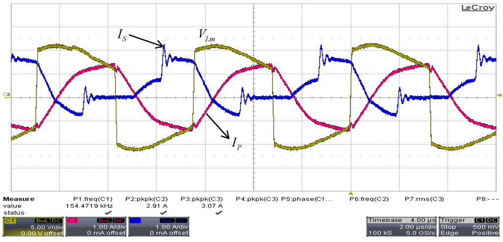 Figure 21 shows the test waveforms of the LLC converter under full load condition. Channel 1 is the waveform of the transformer’s primary side voltage (), Channel 2 is the waveform of the transformer’s primary side current (), and channel 3 is the waveform of the transformer’s secondary side current. In the case of channel 3, a 90 degree phase difference occurs according to the winding direction, and the current path is determined according to the voltage difference among each channel.