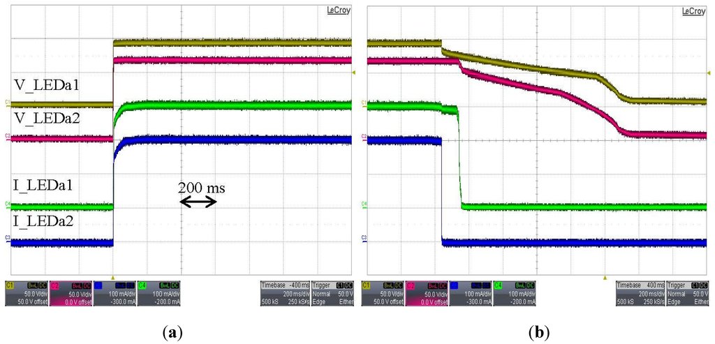 LED voltage and current in the case where the converter is turned on and off. (a) Turn on; (b) Turn off.