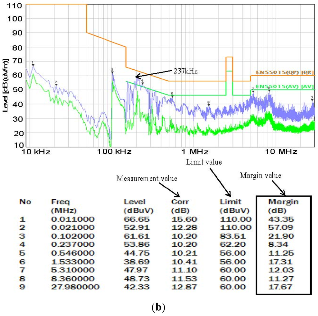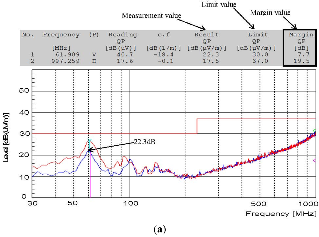 EMI test results. (a) EMI RE Test result; (b) EMI CE Test result.