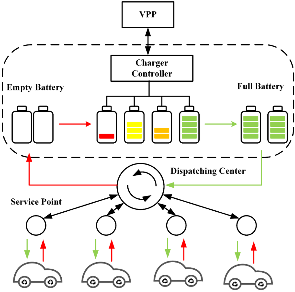 As shown in Figure 2, a BSS consists of a charger controller and battery packs. The charger controller charges and discharges the battery packs under the unified control and management of the VPP. The battery packs, including empty packs and full packs, are controlled by a dispatching center. The dispatching center collects empty packs from service points, and transports them to a warehouse for recharging. Meanwhile the center dispatches full packs to service points, then rents them to EV consumers. When the power price is high, BSS may sell power to the grid by discharging, and it can charge the batteries at low price.