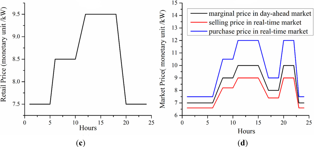 (a) Forecasted load; (b) The EV battery demand; (c) The retail price; (d) The marginal price in the day-ahead market as well as the selling price and purchase price in the real-time market.