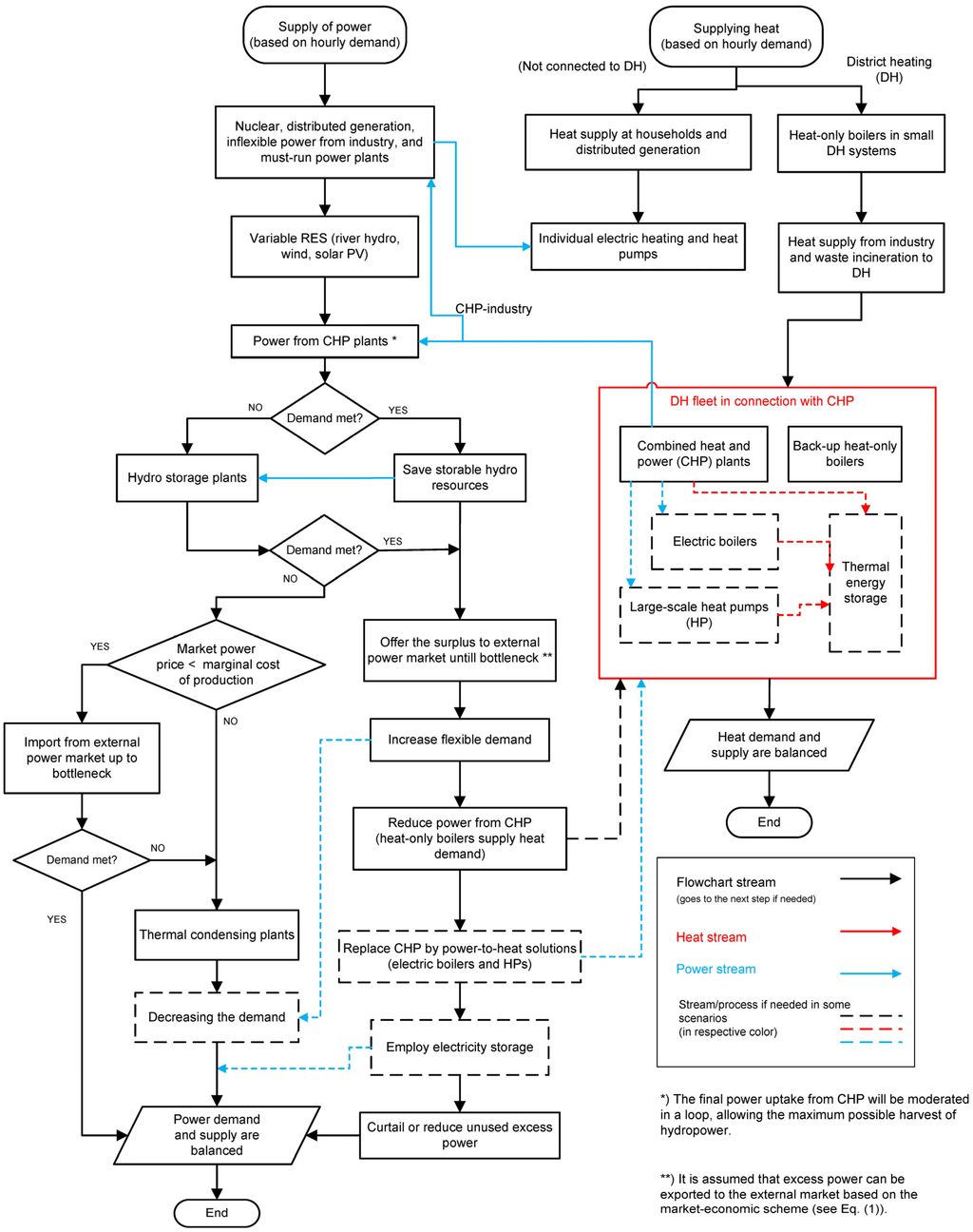 To model the energy system, we employ the algorithm presented in Figure 1, by the aid of EnergyPLAN modeling tool. The optimization is performed based on a market-economic scheme, in which the power producers seek to optimize their profits in a competitive market so that electricity is produced with the minimum possible costs. This resembles the liberalized electricity markets with marginal cost-based pricing mechanism. For each particular hour during the year, the power and heat demand is first quantified. Then, inflexible power production modes maintain a major part of the demand. This encompasses nuclear baseload, river hydro, non-adjustable distributed generation, inflexible power production in the industry, and other must-run power plants (grid stabilizing plants, for example). Variable RES-E is another contributor in this step, which cannot be controlled, adjusted, or converted to the other energy carriers in the first place. The abovementioned power plants supply the main fraction of the electricity demand in that hour in question.