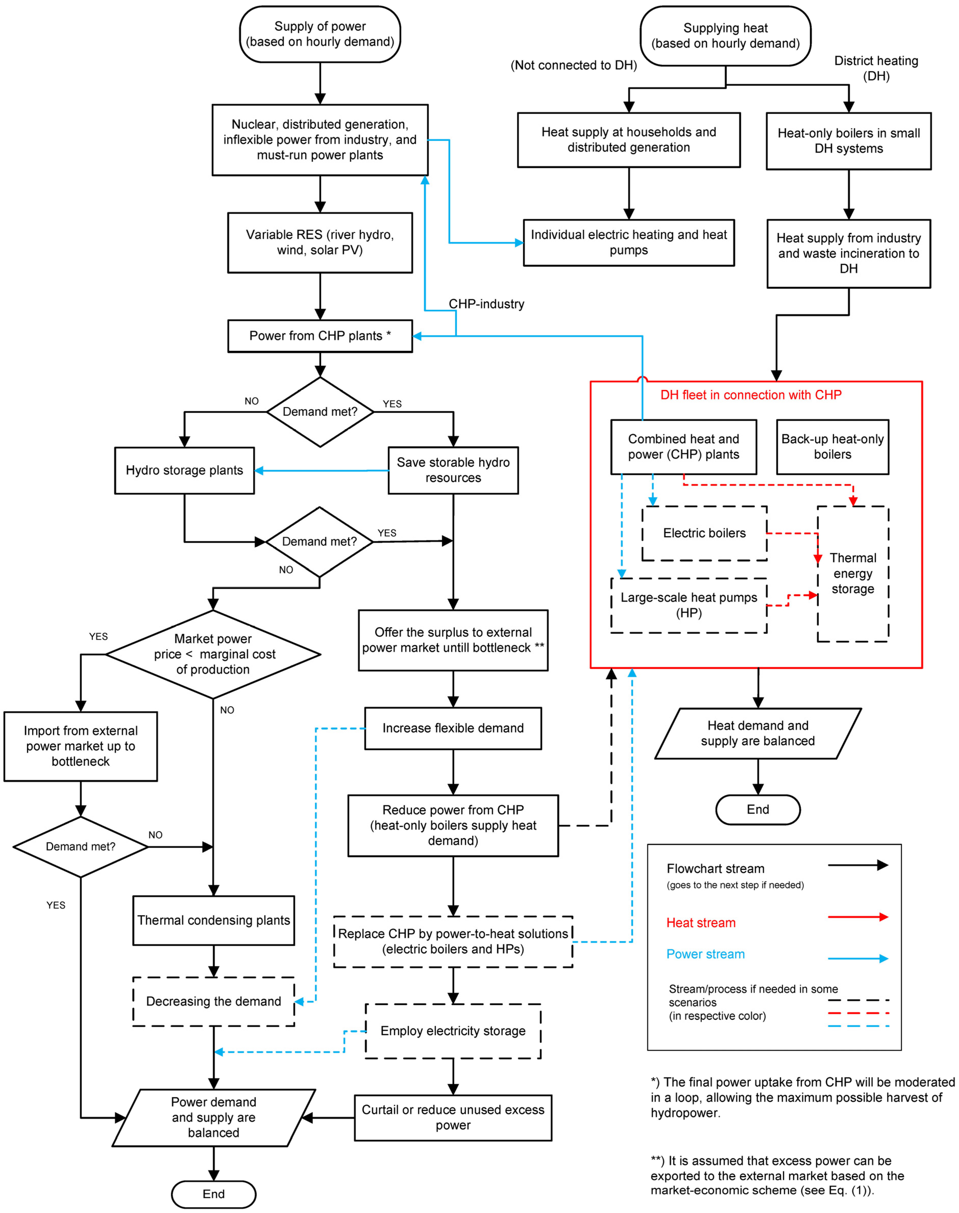 On the other hand, heat demand is partially met by heat generation at the household level (individual heat pumps (HPs), electric-resistant heating, and small-scale fuel-combusting boilers), as well as distributed heat generators at a regional level. Then, the annual heat demand in the district heating (DH) networks is determined for each individual hour (see Section 3.3 for more details). CHP plants together with heat-only boilers supply the heat demand in the DH networks. Consequently, the respective power produced by the CHP plants is fed to the power grid. Next, the storable hydro resources maintain the remaining power demand.
