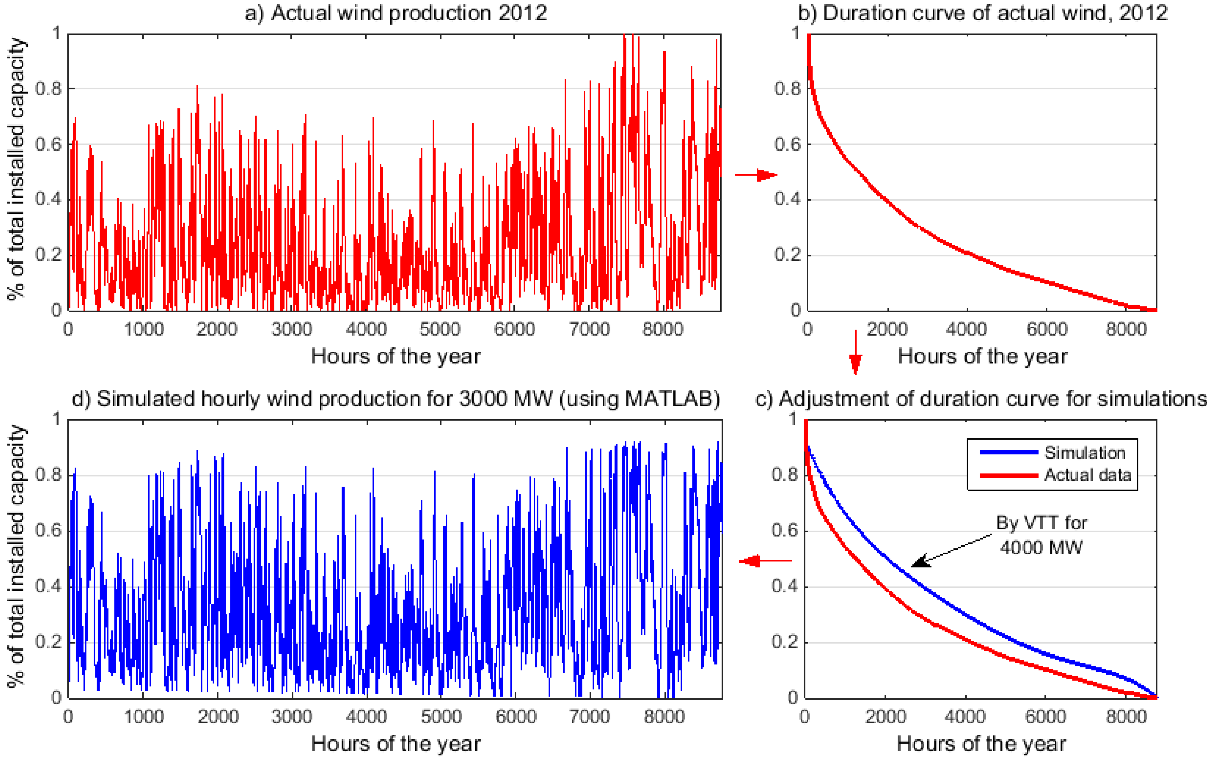 Methodology in modeling and simulation of large-scale wind integrations in four steps: (a) Actual wind distribution in 2012; (b) Actual duration curve; (c) Comparing actual duration curve with simulations by a comprehensive wind integration study [33]; (d) Reproducing hourly variations from duration curve for any desirable installed capacity.
