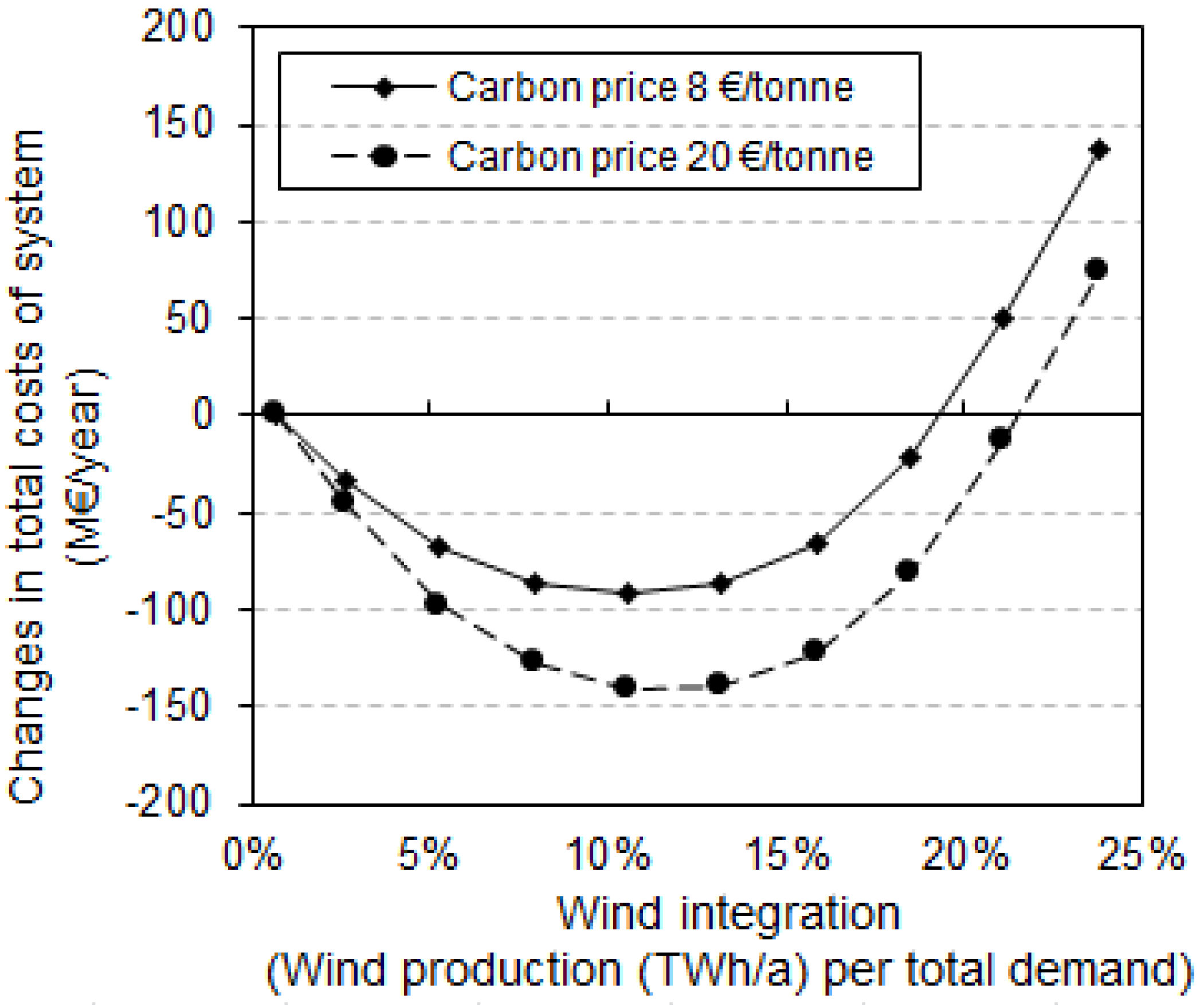 Integrating wind is still economically profitable up to 19% (Figure 4). The profitability deteriorates beyond this level, due to the extensive substitution of power from CHP with wind power, which results in a more frequent use of heat-only boilers. The economics of different wind integration levels is investigated for two different carbon emission prices in Figure 4, promising more cost savings in higher carbon prices. Other techno-economic impacts of wind on unit commitment and reserve capacity are not considered in this analysis due to the limitations explained in Section 2.2, while the balancing costs are included.