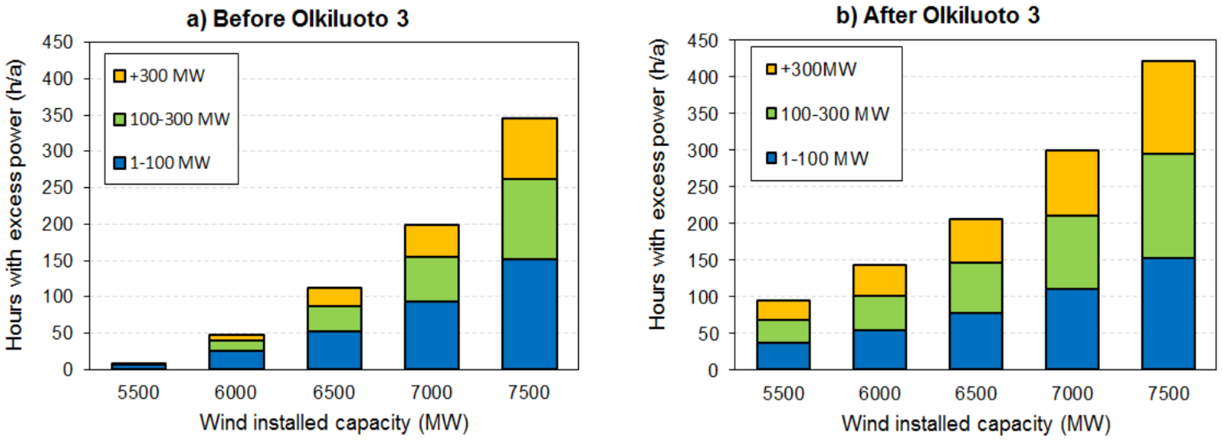 Hours with excess power in different wind integration levels (a) before and (b) after a nuclear plant with 1600 MW capacity (OL3).