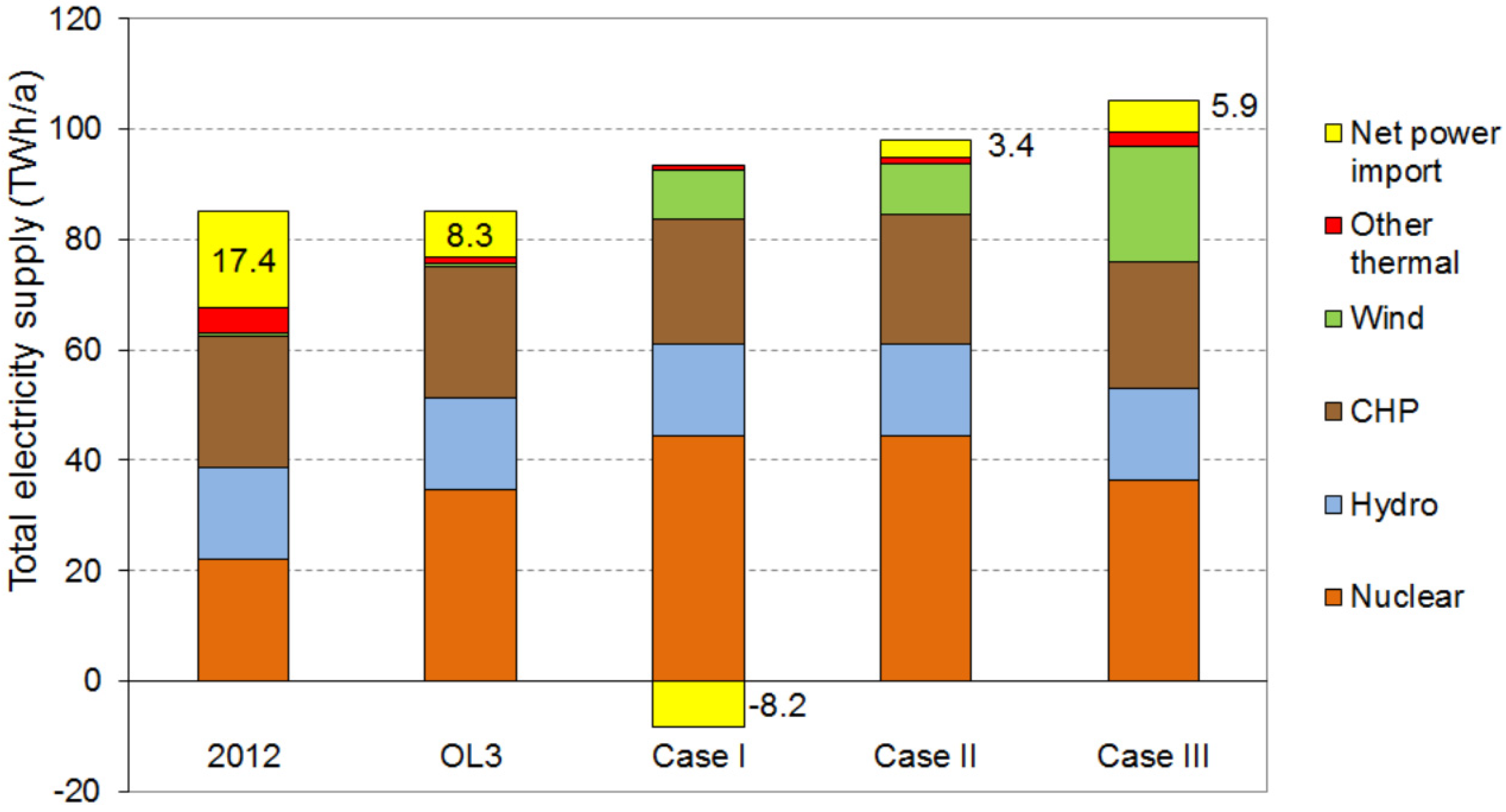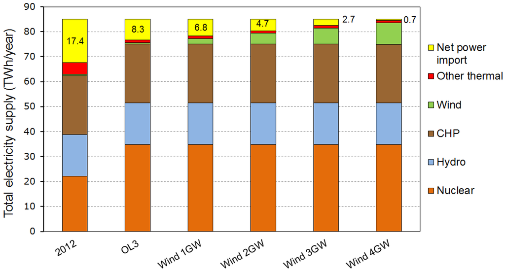 Evolution of power supply mix in Finland from 2012 to the commissioning of Olkiluoto 3 (OL3), and further in wind integrations up to 4000 MW (power demand 85 TWh/a)—The amount of net power imports are labeled on each bar.