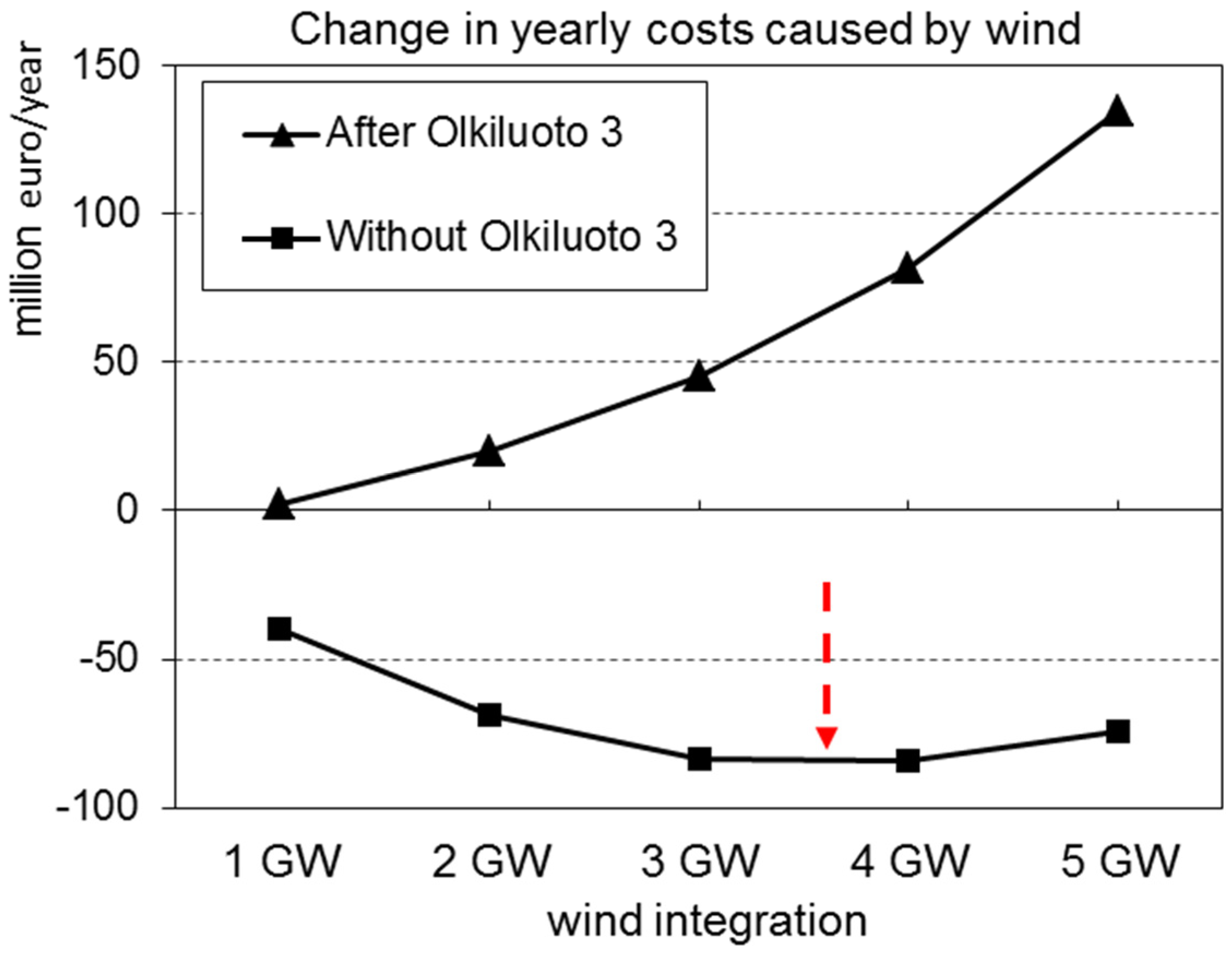 Changes in total annual costs of the Finnish energy system in wind integrations up to 5000 MW with and without the new nuclear plant (OL3), (interest rate 5%).