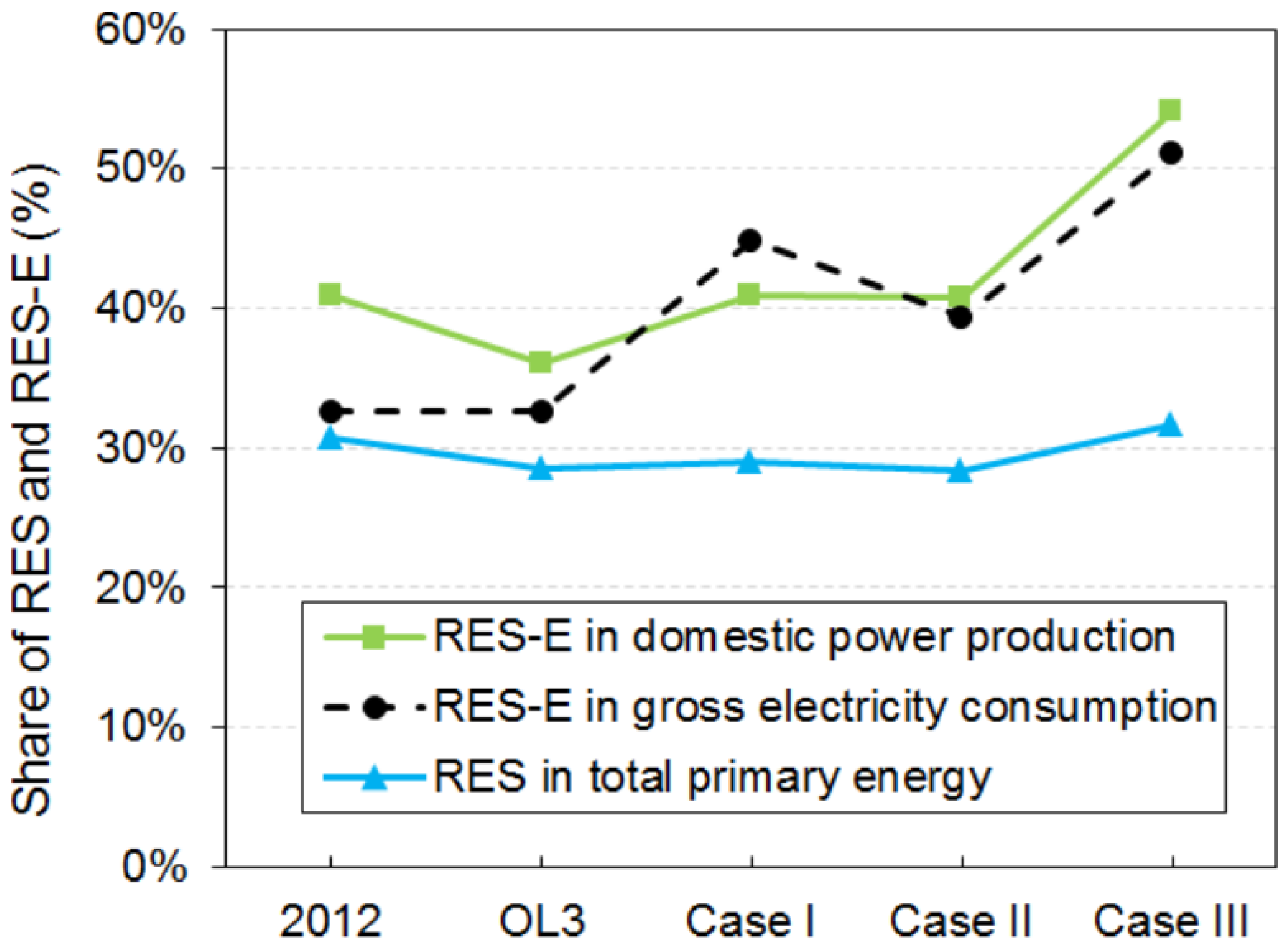 | Different Scenarios | Power Demand (peak load) | Nuclear Capacity (share a) | Max Wind Capacity (share b) | Max RES c in PEC | Max RES-E d | Max Carbon-free Power e | Net Power Imports f | Change g in CO2 Emissions | Change in Total Costs h |