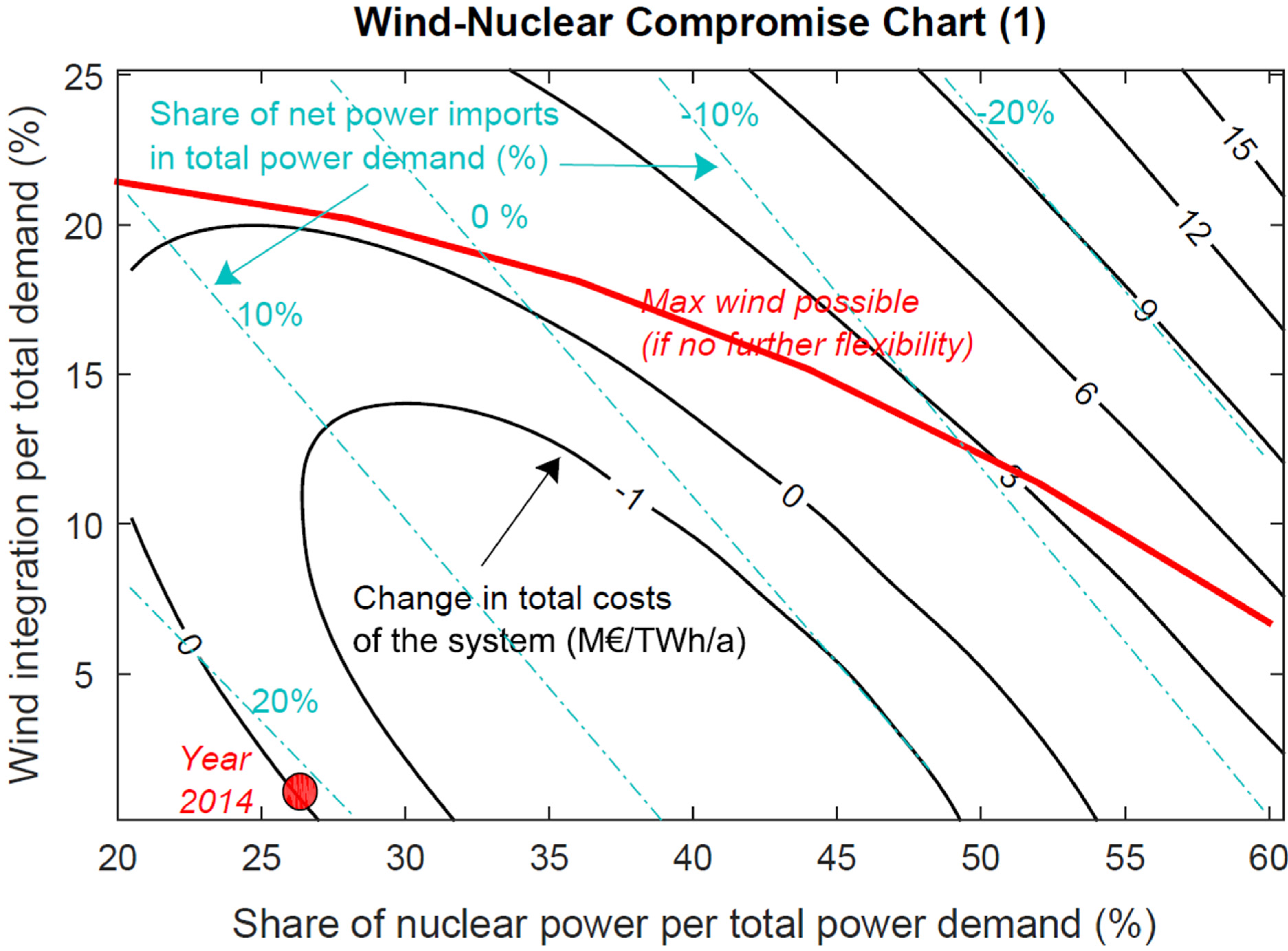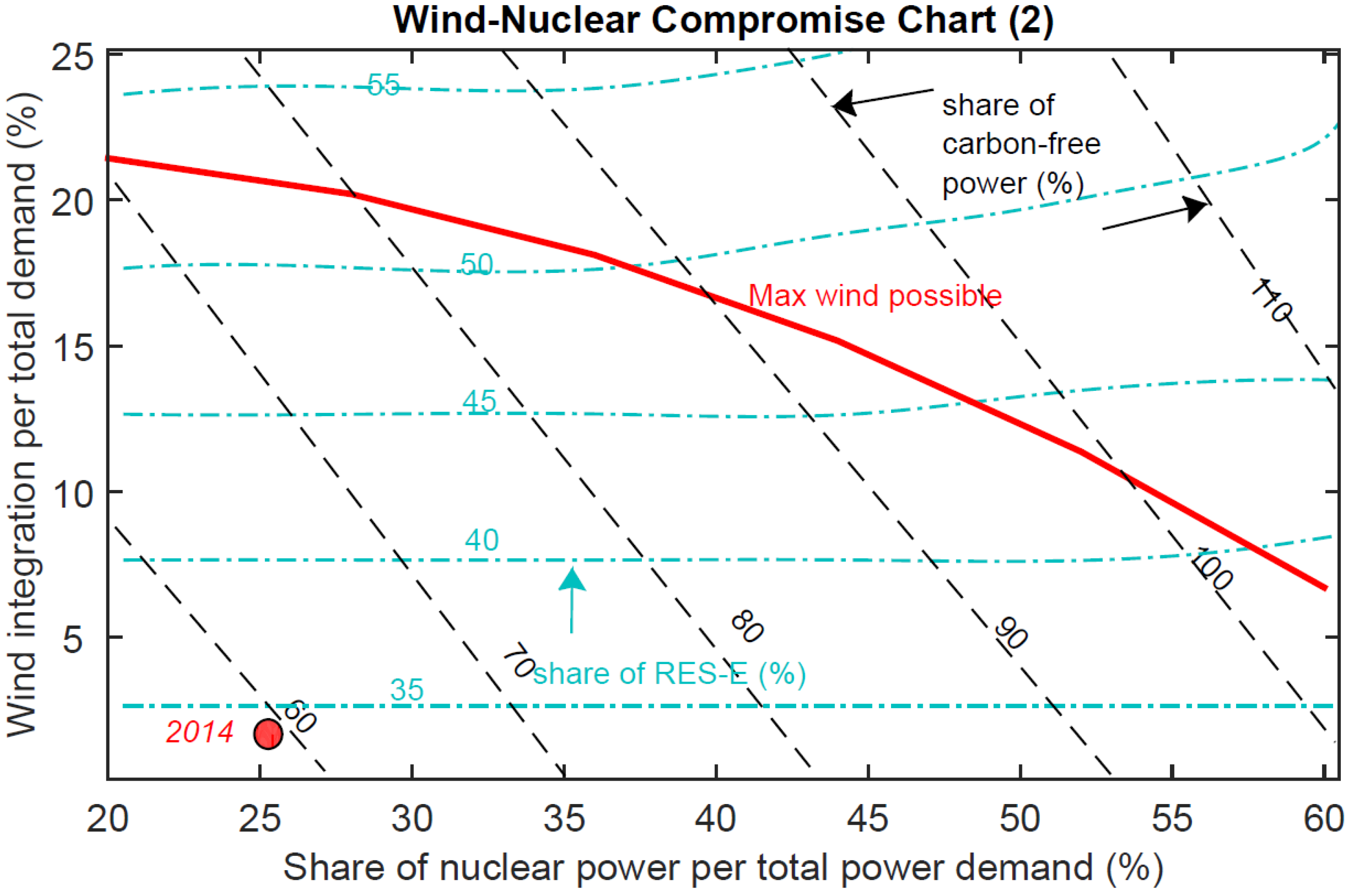 Optimization map of wind-nuclear compromise for evaluating the share of carbon-free power production (black dashes) and RES-E (blue dashes), compared with maximum possible wind (red curve) and today’s conditions (red circles). The ratios are per total power demand (see Section 4.4 for explanation).