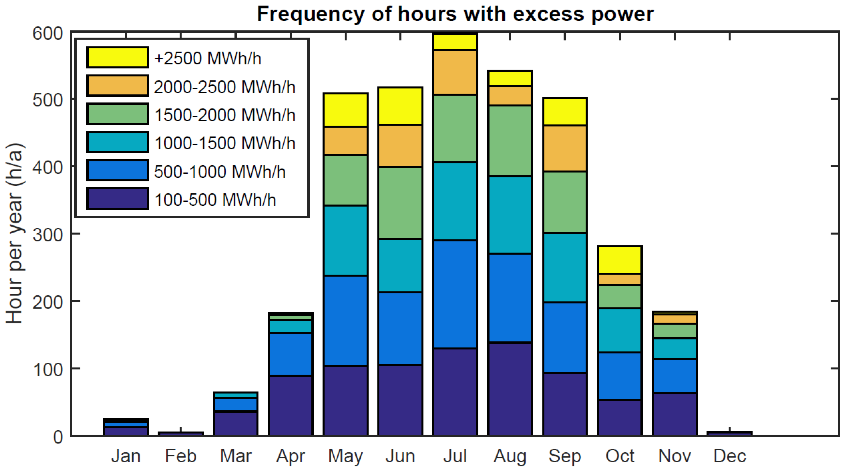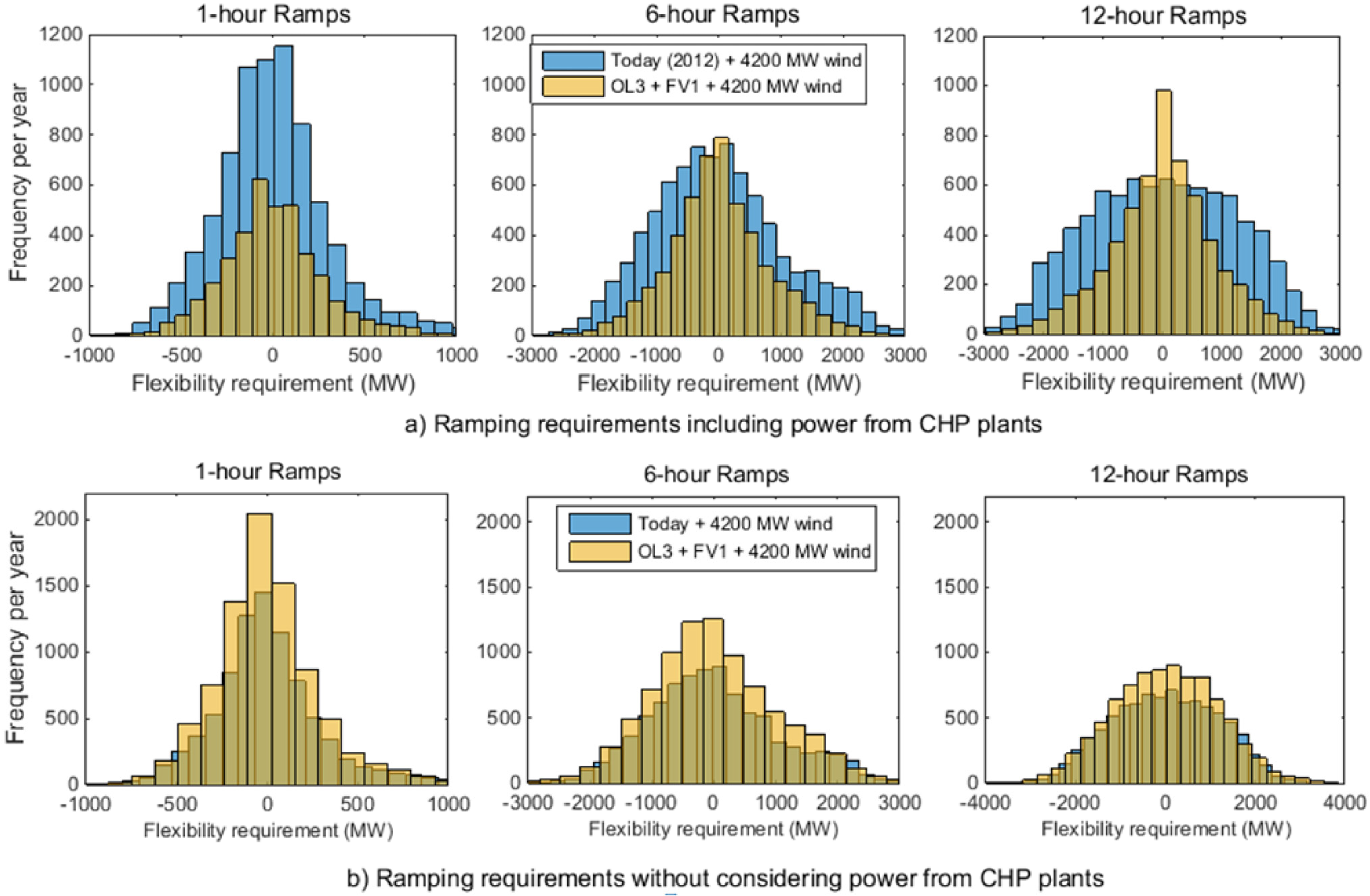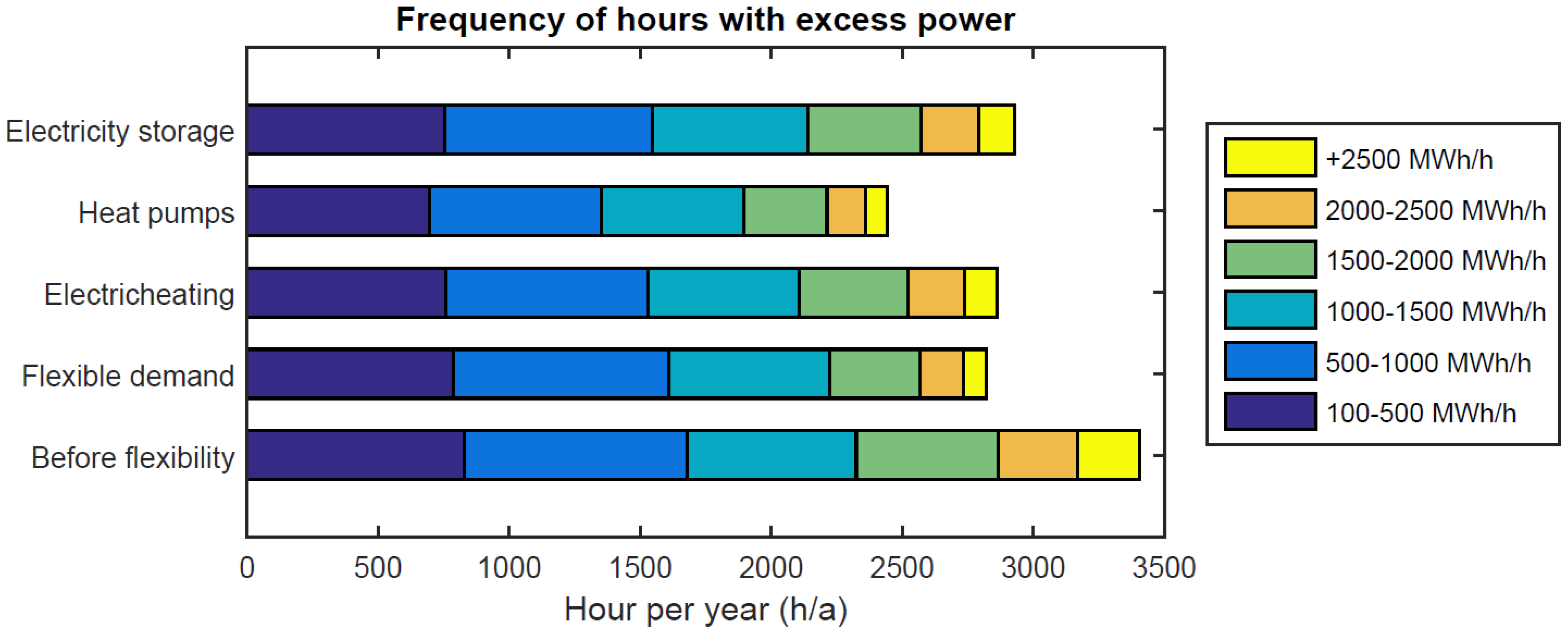 From wind integration perspective, OL3 constrains the room for wind if the power demand remains unaltered. After OL3, in wind installations of 6500 MW, there will be approximately 205 h/a with excess power up to 500 MWh/h, indicating a 100% growth compared with the situation before OL3. Figure 5 illustrates the case of wind integration before and after OL3, this NPP diminishes the maximum possible capacity for wind by 500 MW.