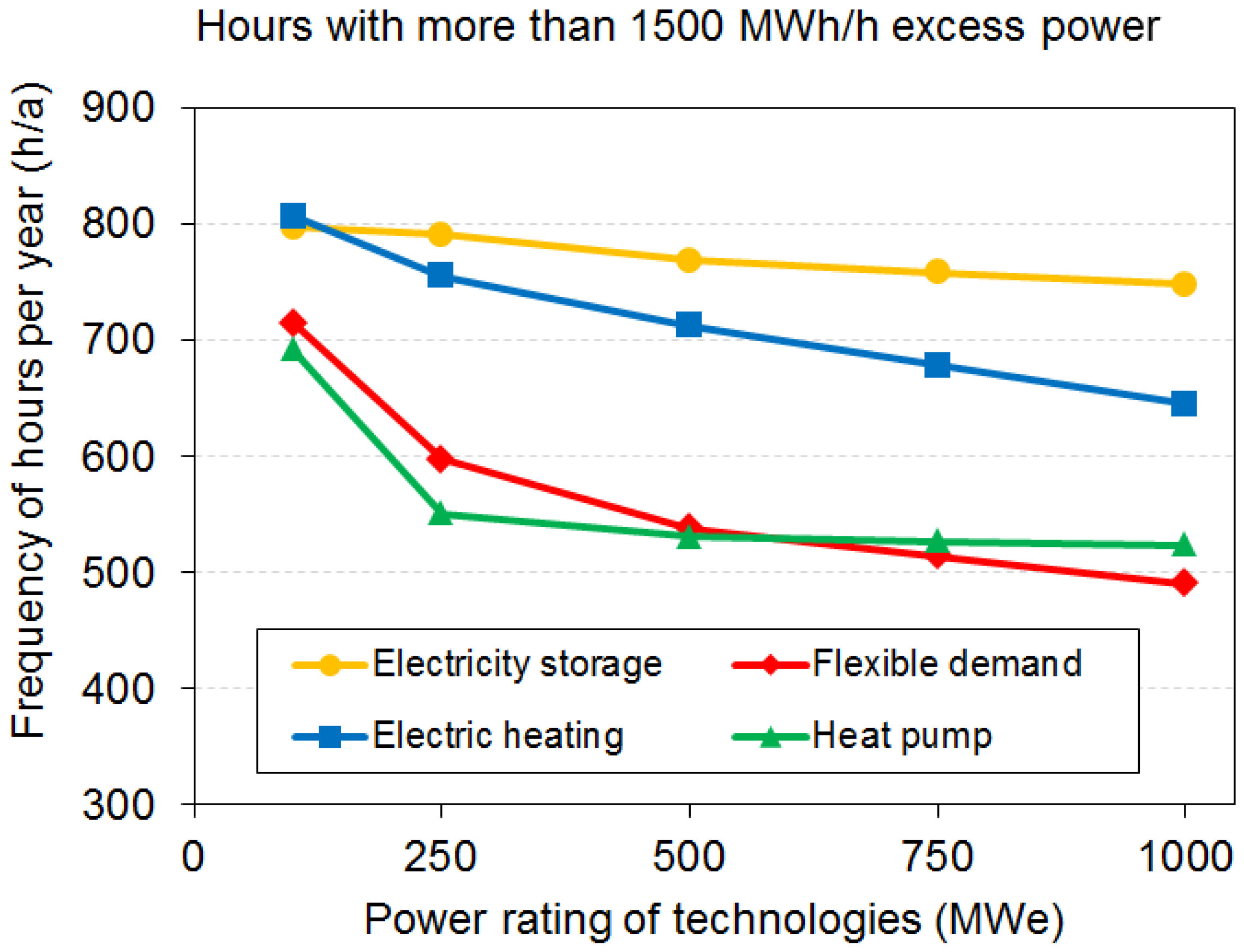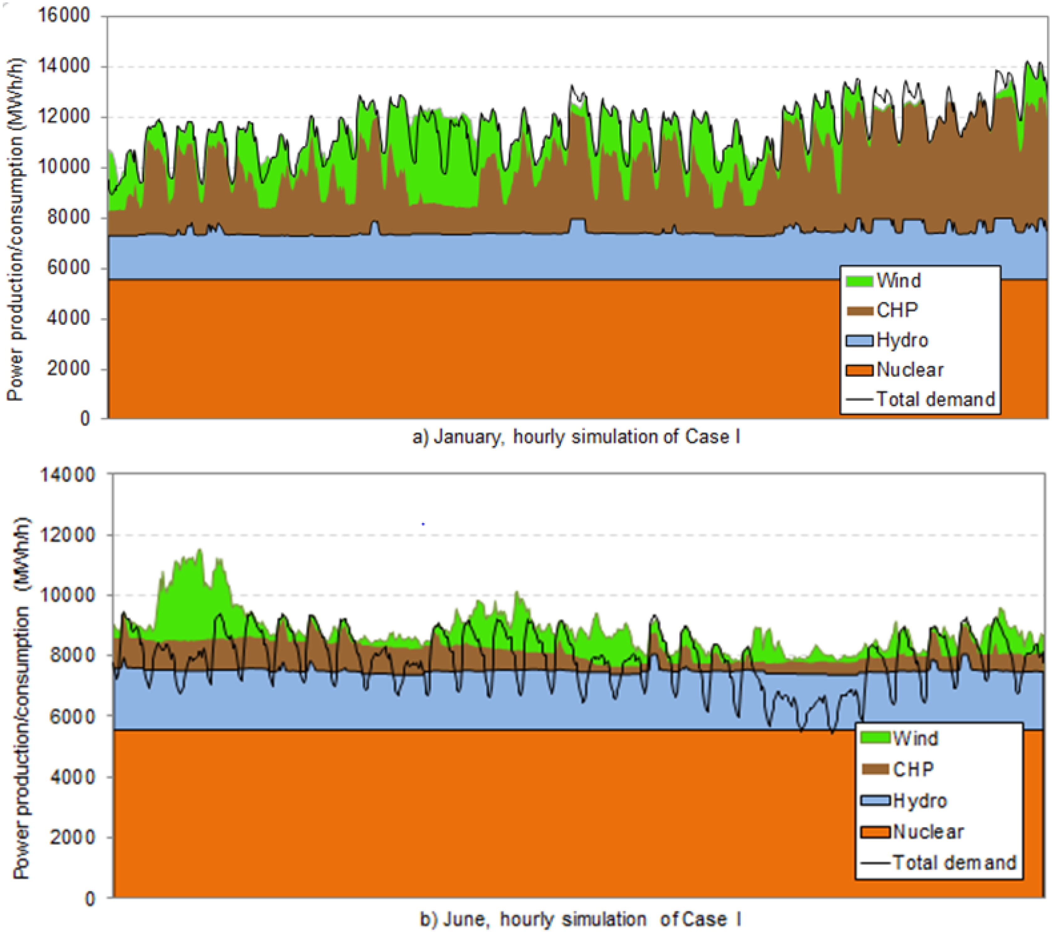 This section presents the analysis of wind integration in different nuclear capacities. We consider a set of general assumptions for all the scenarios, including an interest rate of 5% for investment in power plants. The trend of hourly prices is as for the Nordic electricity market in 2012. According to the national transmission system operator (TSO), Fingrid, the power system is capable to activate flexible demand of 200–400 MW capacity [64]. Accordingly, we primarily consider the following flexibility measures in this study in periods of excess wind production: (i) 400 MW flexible demand with a time scale of maximum 24 h; (ii) the possibility of export to the external power market (2012 interconnector capacity to the Nordics); (iii) 33 MWe LHP (i.e., Katri Vala plant) with the associated thermal storage; and (iv) decreasing the power production in CHP plants.