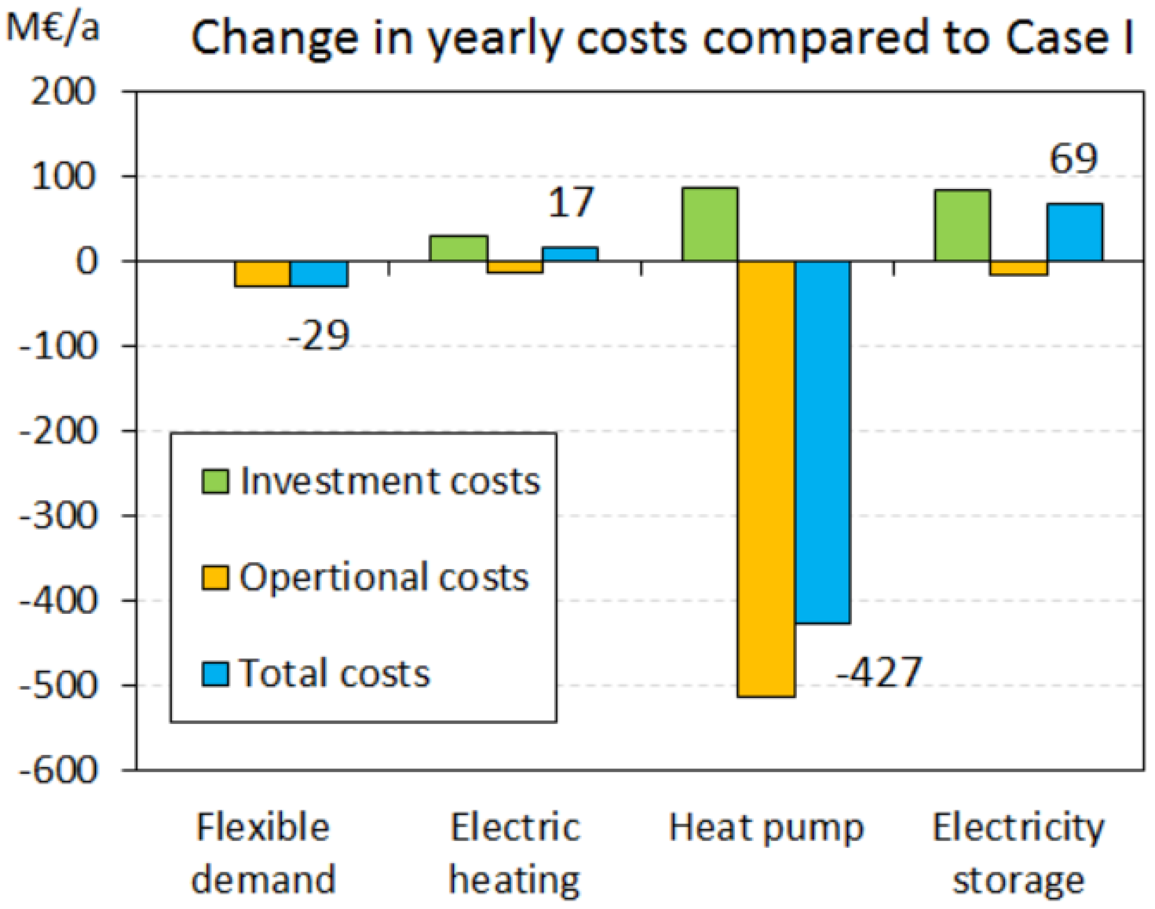 After applying the methodology explained in Section 2, we increase the share of wind capacity to monitor the impact on the existing energy system. Regarding the costs, we reviewed different studies on the present costs of wind installation [7], offshore sites [65], and the future costs [59,66]. It is expected that the investment cost of wind generation in Finland would decrease by 5% by 2030 with expanding the installed capacity [67]. The cost of power imbalance entailed by wind into the power system is also considered in the cost calculations, amounting 3–4 €/MWh of wind production [68,69].