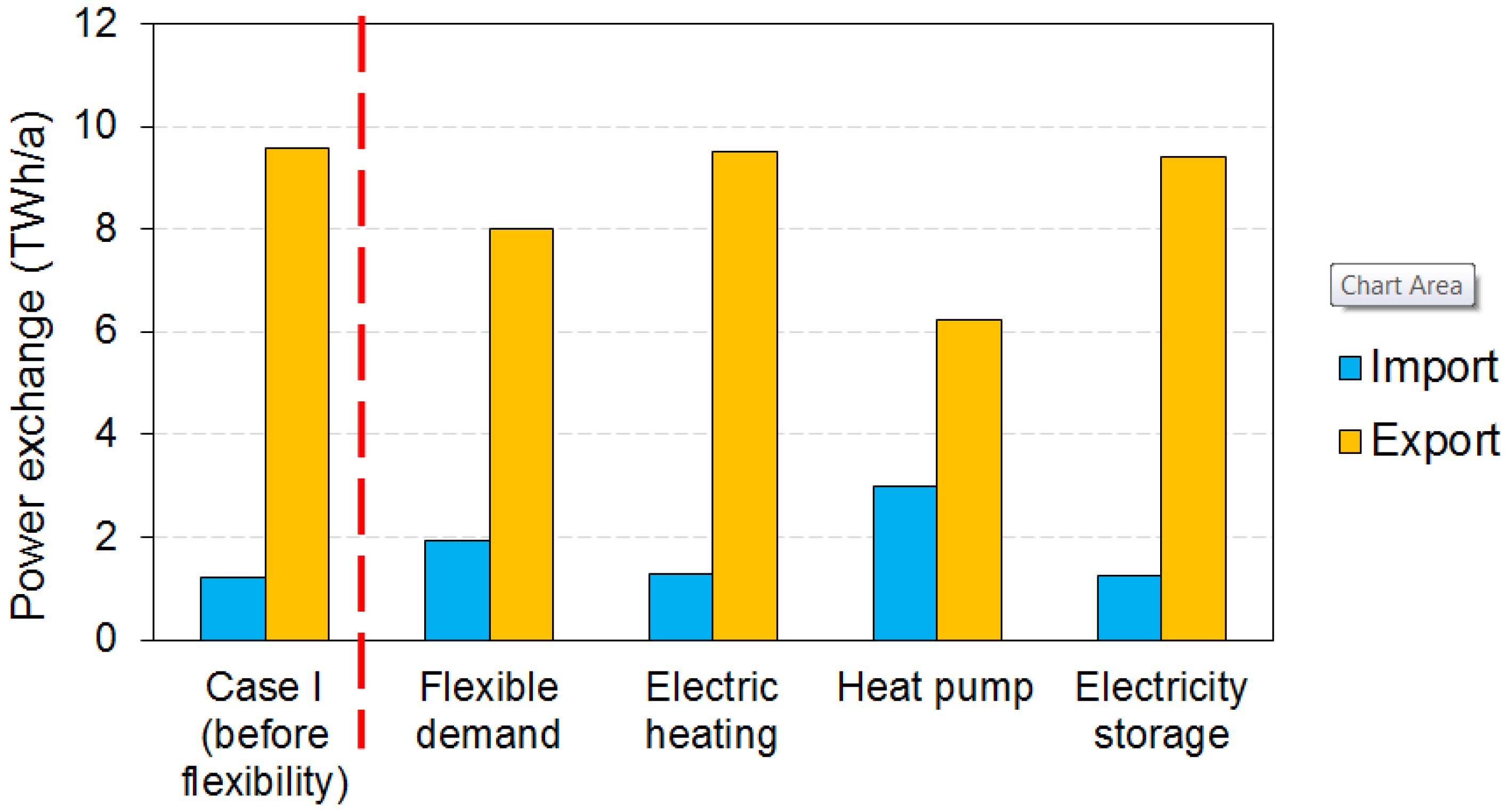 The net power export from the system (to be inserted in Equation (1) with a negative sign) will reduce the power prices in the external market. Therefore, by adopting an iterative loop, EnergyPLAN optimizes the governing prices after the addition of each power production mode to guarantee the operation of the least-cost generation mode (versus the possibility of power exchange). In case of bottleneck in the interconnector, the revenues are divided equally (half of the costs/benefits are allocated to the system in question). This is analogous to the actual function of a typical electricity market. The external power market is assumed to function based on the Nash–Cournot concept, in which the other producers (even in the external market) do not alter their production in different scenarios projected for the modeled system. After reaching the bottleneck in importing power, the deficiency in power supply is compensated with domestic condensing thermal power plants, demand side management, and peak/reserve plants consecutively. In case of excess power (e.g., from variable RES), a set of flexibility measures must be applied, so that the maximum possible amount of RES-E could be absorbed to the system. Finally, the power demand is balanced and the remaining RES-E has to be curtailed (impossible to use, export, store, or convert to other energy carriers). For more details, concerning the problem formulation in a market-economic scheme the reader can refer to the documentation of EnergyPLAN tool, Chapter 6 in version 11.1, publicly available in [23].