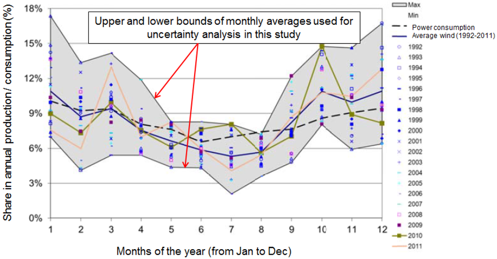 Since EnergyPLAN is a deterministic tool, a systematic uncertainty analysis is irrelevant and non-applicable to this study. However, as we simulate large-scale wind integrations on an hourly basis, the future fluctuations might influence the results. Koivisto et al. [36], proposes an uncertainty analysis for wind integration simulations by employing the Monte Carlo method. We obtained a set of time series of hourly wind productions from the authors of the latter. To incorporate more realistic assumptions for accepting wind time series for our analysis: (1) We check the capacity factor of the time series; (2) we consider the monthly-averaged wind production in the past 10 years as upper and lower binding limits for the monthly averages of our simulations (these limits are adopted from [37] and illustrated in Figure A1, Appendix A). For instance, the monthly average of stochastic wind production in our model for January does not exceed the highest historical recorded average nor goes below the minimum average level for this month. After 50 simulation runs, the generated sequences (50 different hourly time series of wind production) were inserted as the input data to the EnergyPLAN model, resulting in 50 different run times. The results for 4000 MW wind installations suggest a deviation of less than 4% in yearly outputs for the total costs and fuel consumption. This implies that the results of this study might have up to approximately 4% error due to the future alterations in the wind regime.
