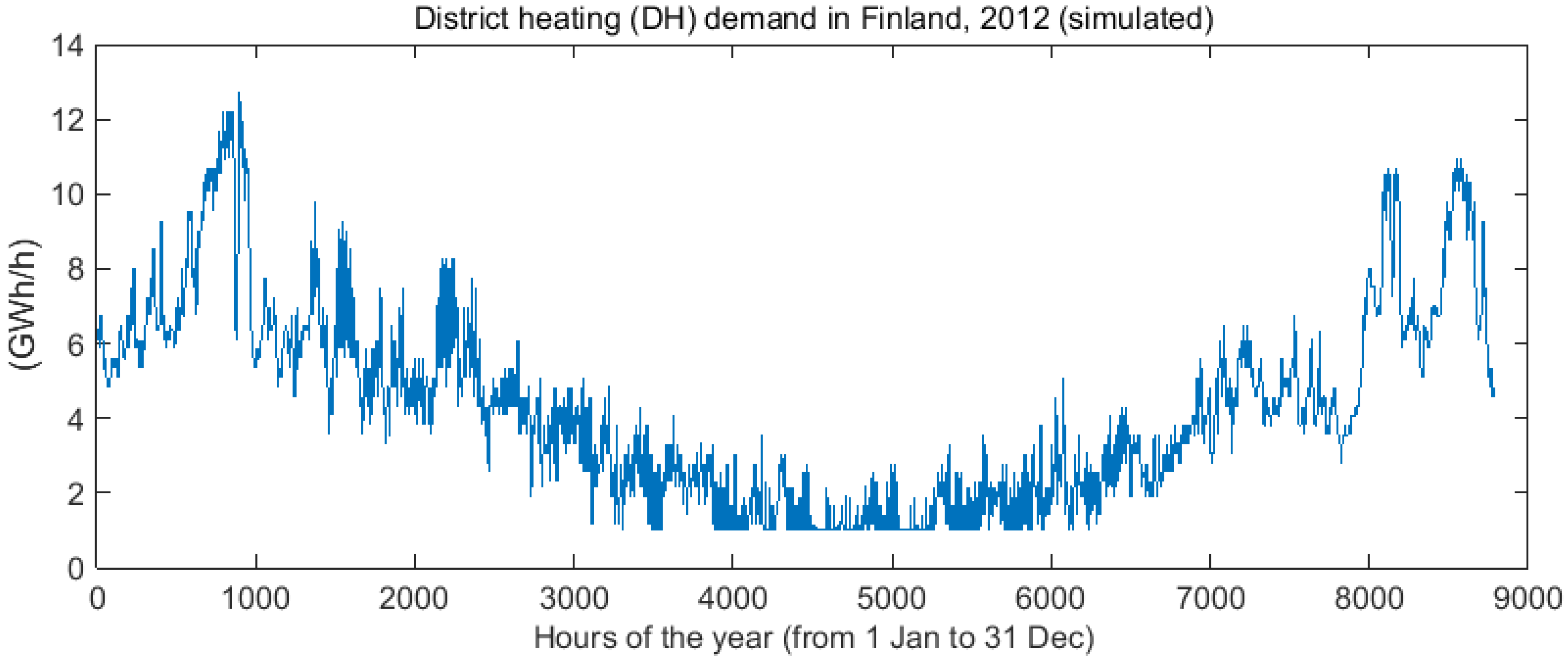To model the heat demand, we employ the heating degree days (HDD) approach. Based on Finnish Meteorological Institute [57] data, the heat demand can be calculated for the indoor temperature need of 17 °C (assuming the remaining heat demand is fulfilled from in-house latent heat, lights, etc.). By applying this approach, the relative variations of space heating demand is determined based on the hourly ambient temperatures (obtained from a weather station in the Central Finland). To accommodate the energy needs for the supply of hot water, a typical share of 30% of the total heat demand is allocated. This method is an approximation, as the heat demand trend is not identical in different regions or different buildings in an extended country like Finland. Finally, by knowing the total annual DH demand (TWh/a), the produced time series of relative heat demand (HDD) can be converted to the hourly DH demand, as illustrated in Figure B1, Appendix B.