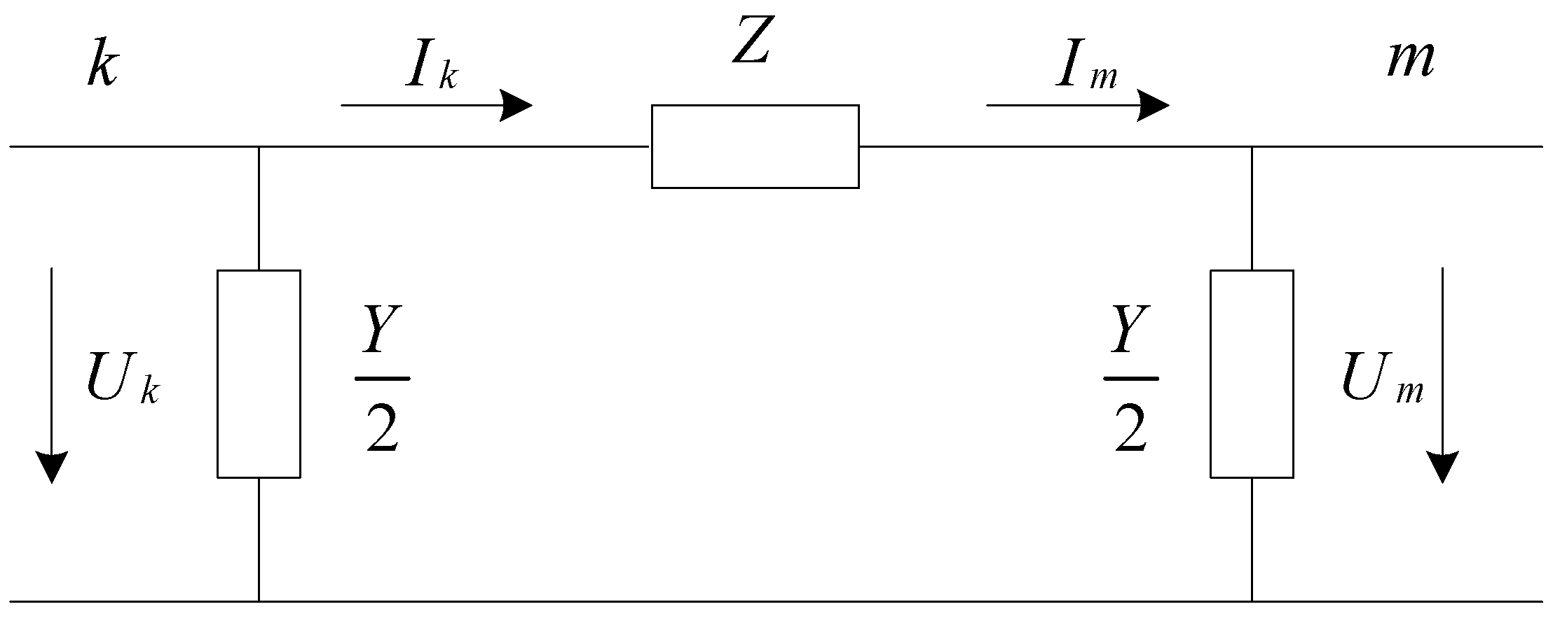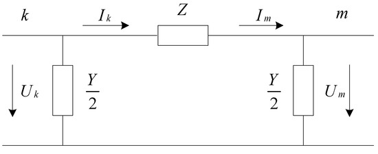 In a power system, transmission lines can be seen as middle-length transmission and the conductance need not be considered, then the equivalent circuit of transmission lines is as shown in Figure 1. In this figure, indicates impedance and indicates admittance. Based on Kirchhoff’s law, we can get:
